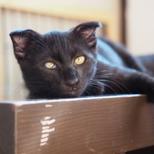 折れ耳に、丸顔ではなく三角顔なので、なんというか、犬っぽいというか、猫っぽくないというか、ヒョウっぽい顔つきです。笑