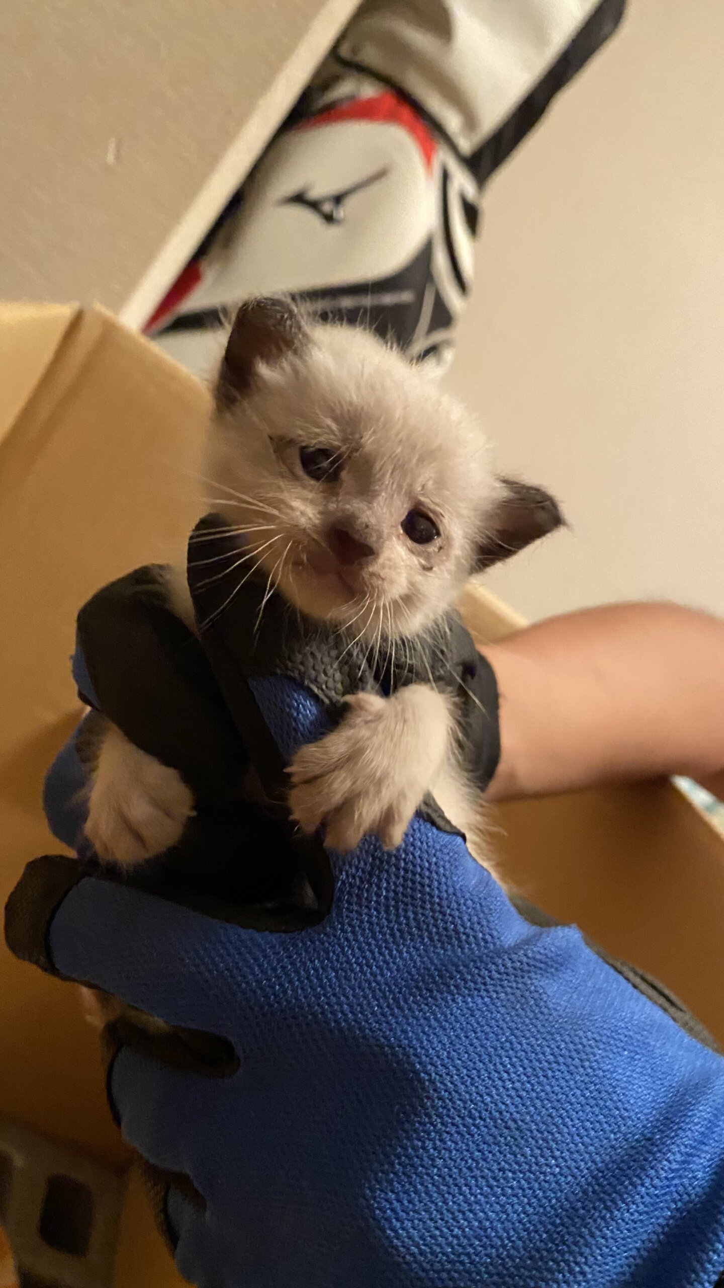 目が青くて、耳としっぽが黒くて全体がグレーっぽい子猫です。健康状態も今のところは大丈夫そうです。