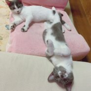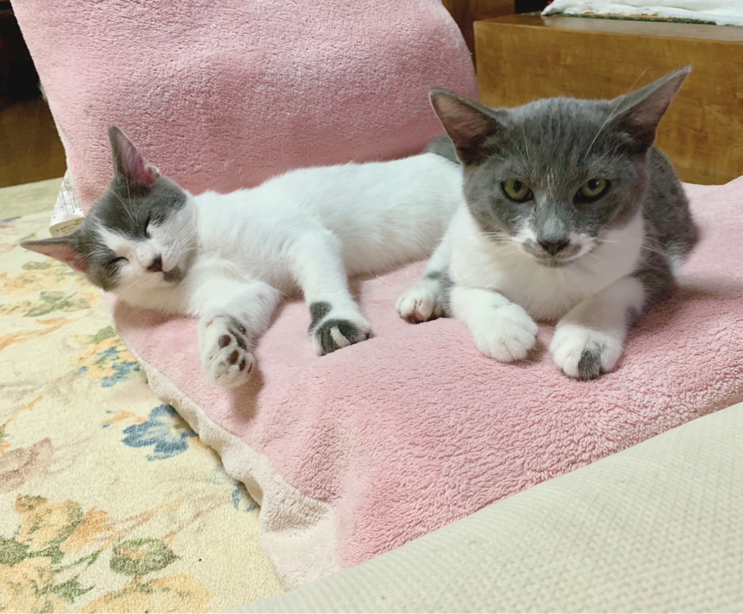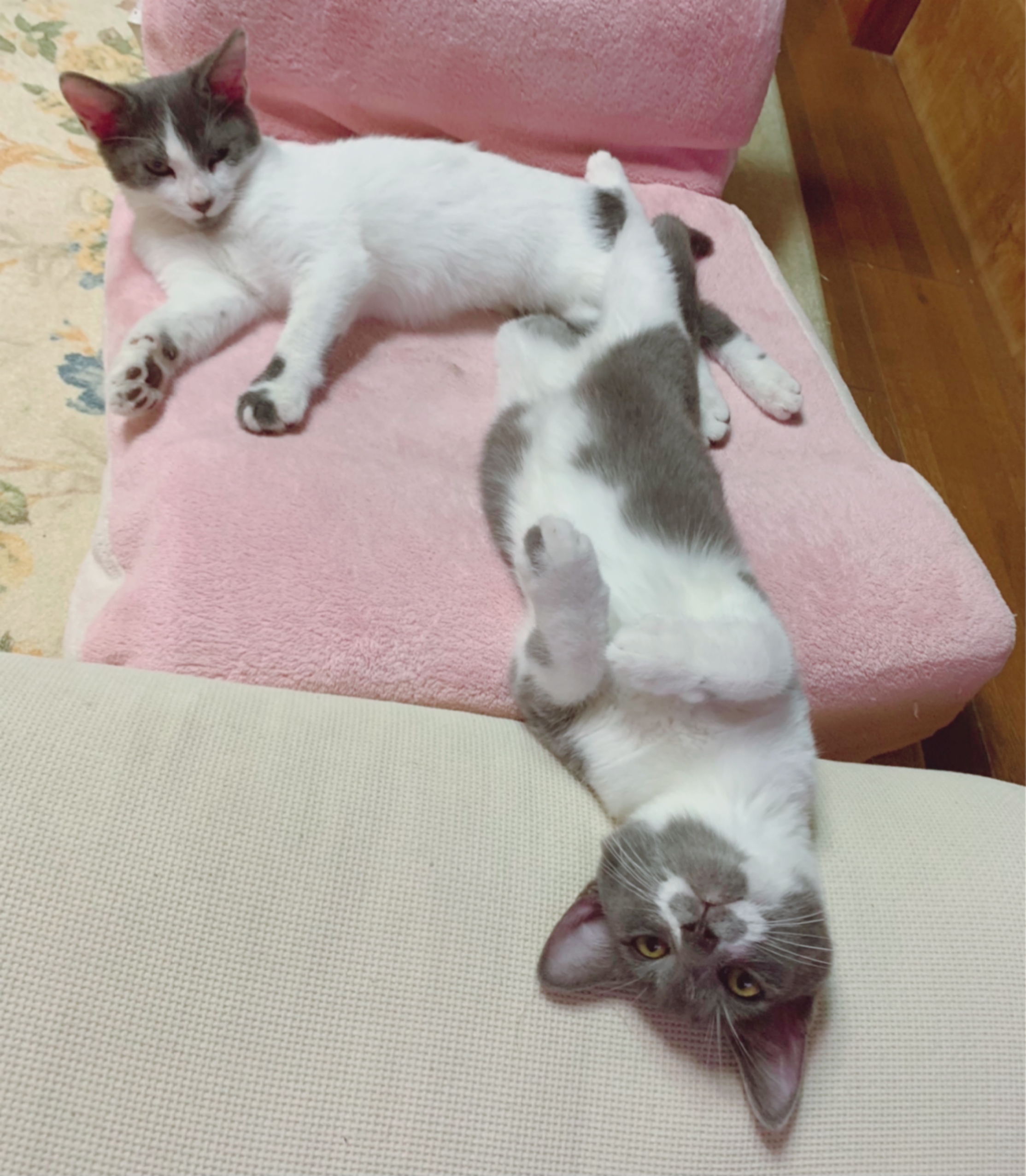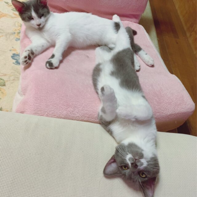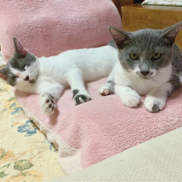 兄妹のモモちゃんと仲良しで、いつもくっついています。