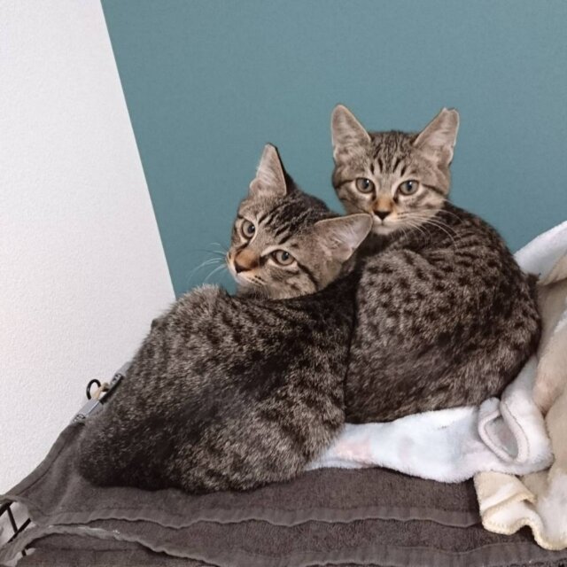 元気いっぱい、おもちゃ大好きな、キジトラの兄妹です。