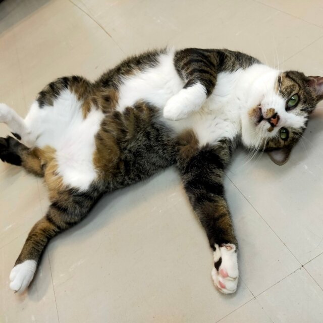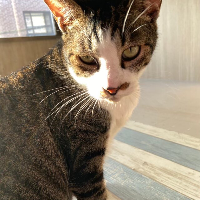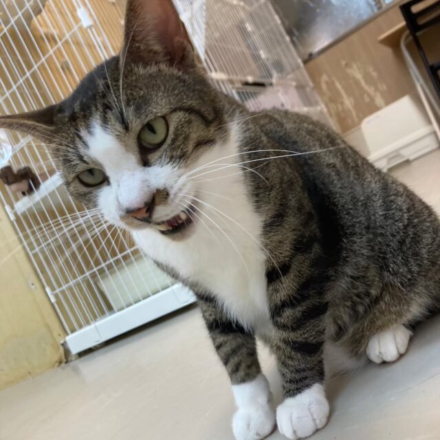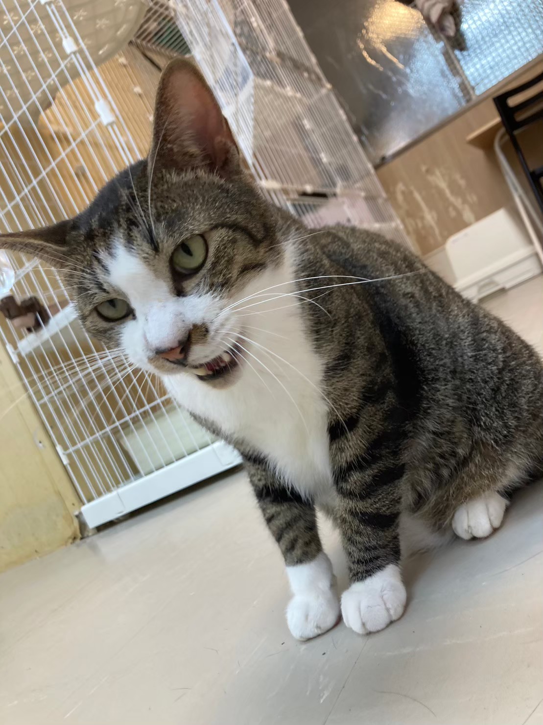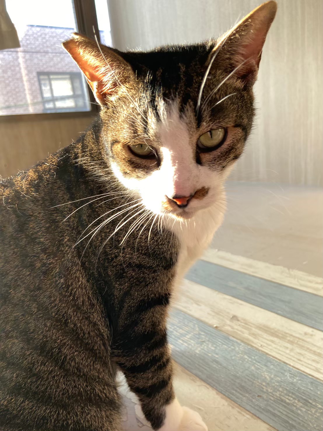 当施設付近でガリガリの状態でいたところ店長によって保護され、2021年11月上旬に当施設に仲間入りしました。人馴れ具合からおそらく遺棄された子なんじゃないかと思われます。