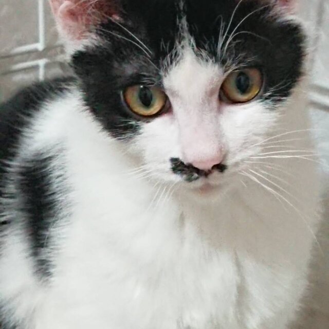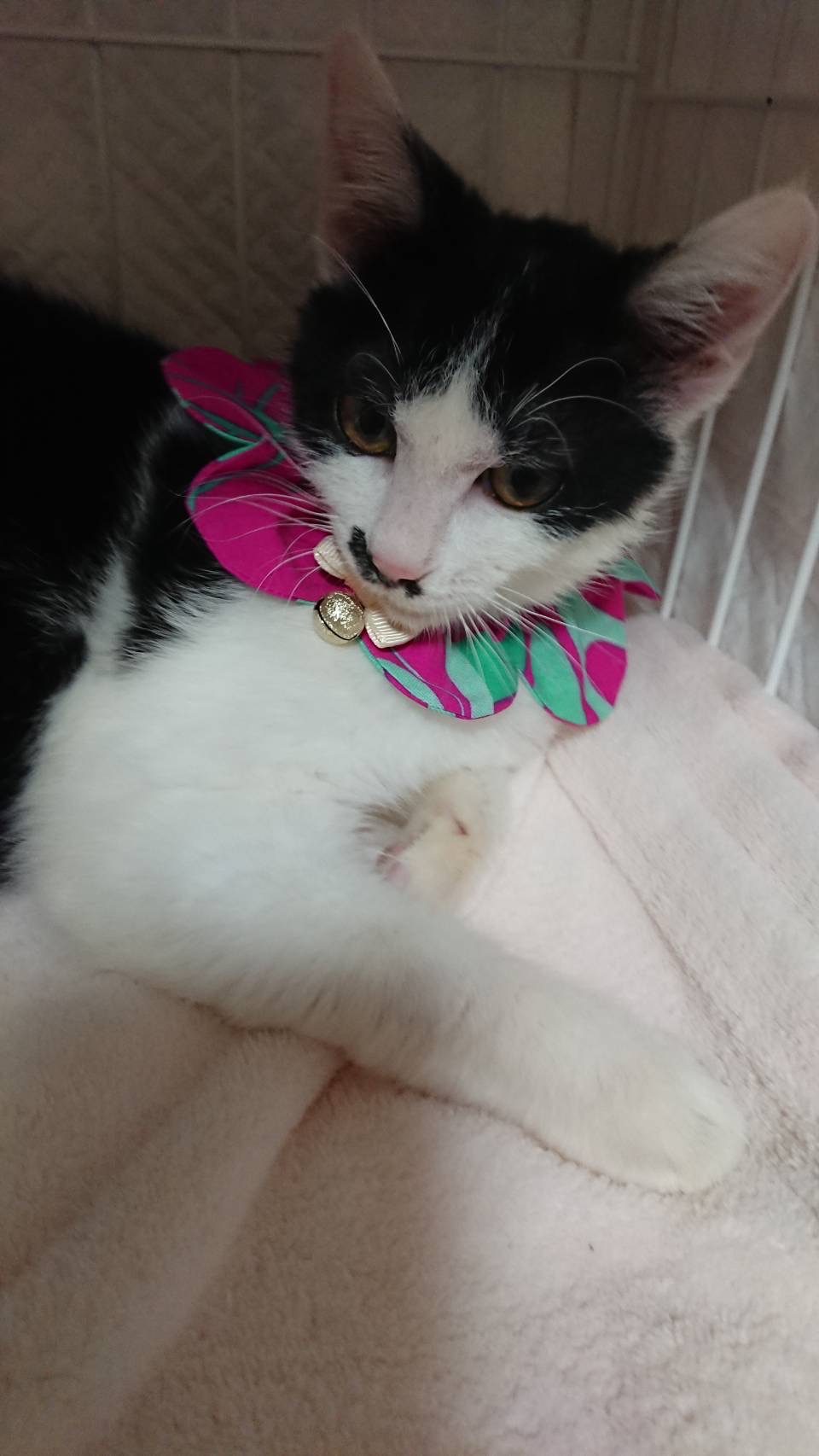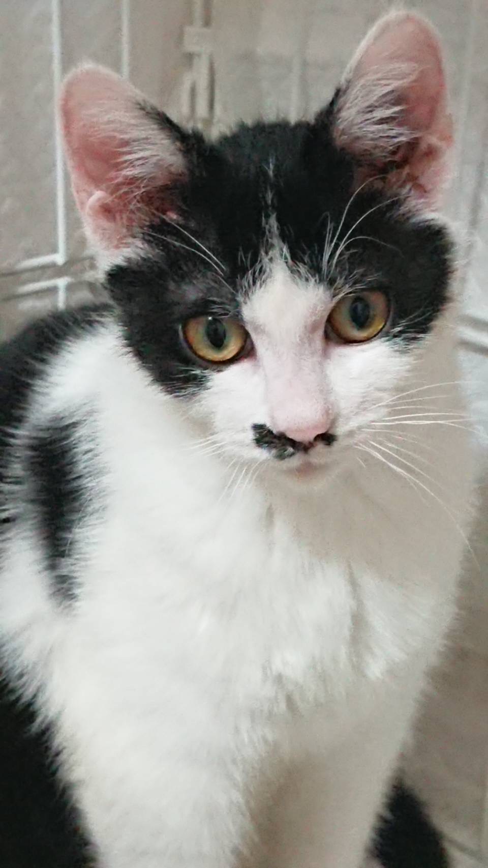 整ったお顔で髭がチャームポイントのとても綺麗な白黒仔猫です。保護した時から穏やかでお利口さんでした。食欲旺盛でよく遊んでいます。ナデナデすると喜んでゴロゴロし、抱っこもできます。名前を呼ぶと可愛いお返事をするハンサムボーイです。