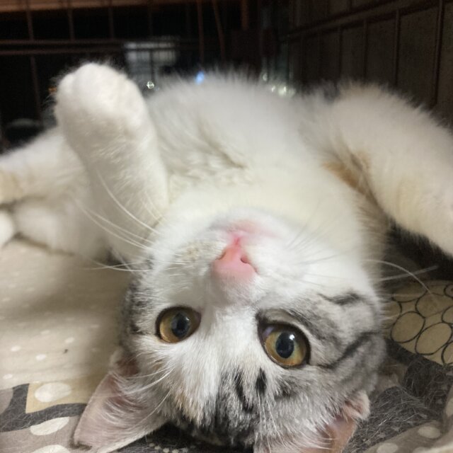 人に大変慣れており、温厚で撫でられ好き、人が来るだけでゴロゴロいいます。甘噛みもなくこてんと横たわり、もっと撫でてほしいと擦り寄ります。