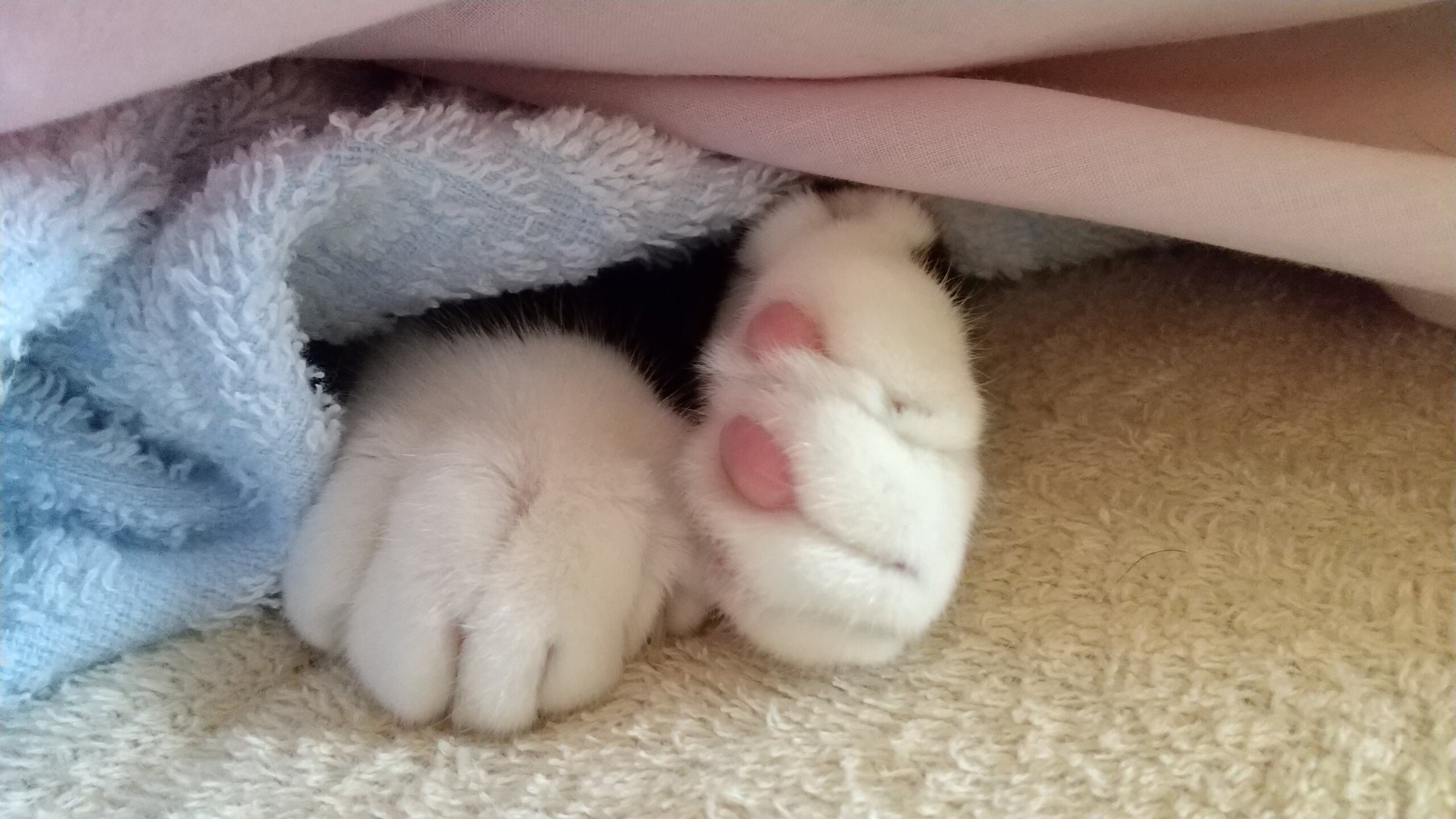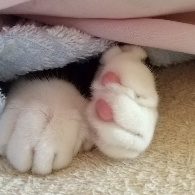 肉球ピンク。1肉球だけ斜めにチョコ色になっている。