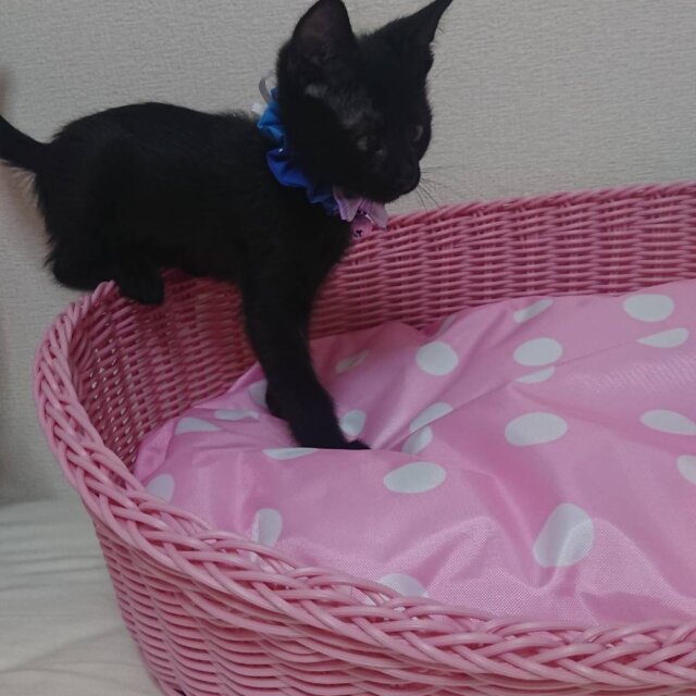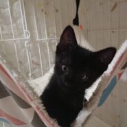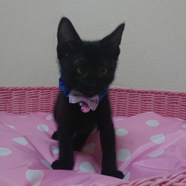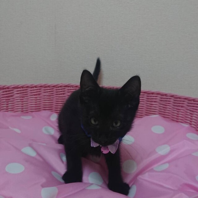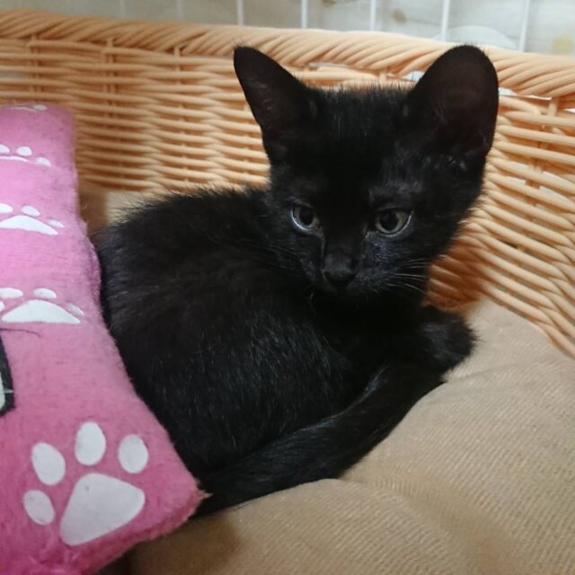 魅力的な黒猫の子猫です。お目目がくりくりでとても可愛いです。健康状態もよく、よく食べて、兄弟と遊んでいます。ママ猫と一緒に保護したので、おうちで生まれました。