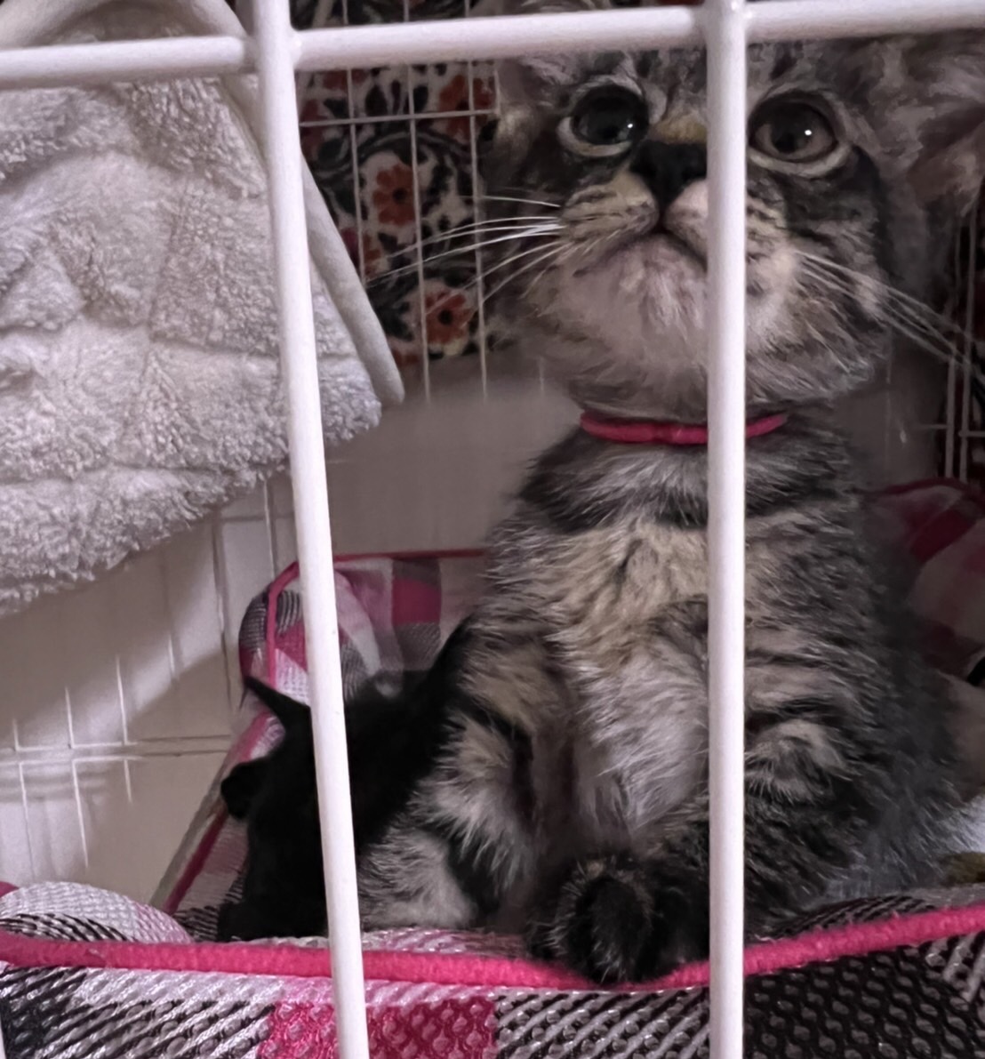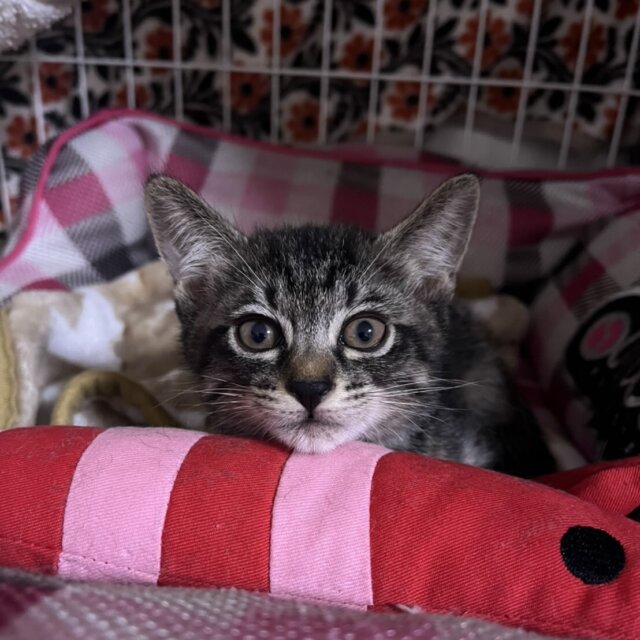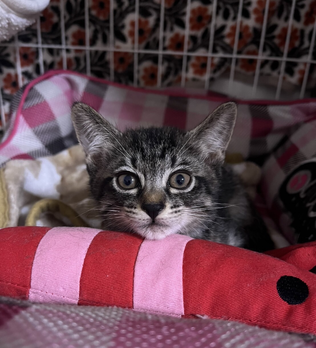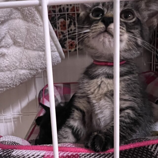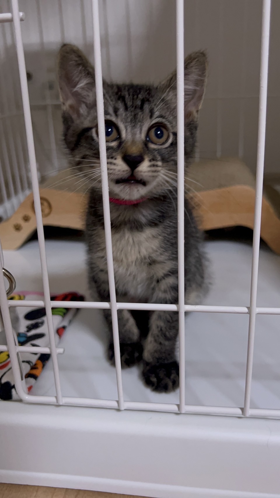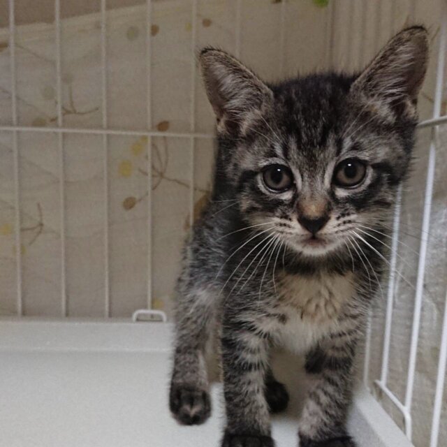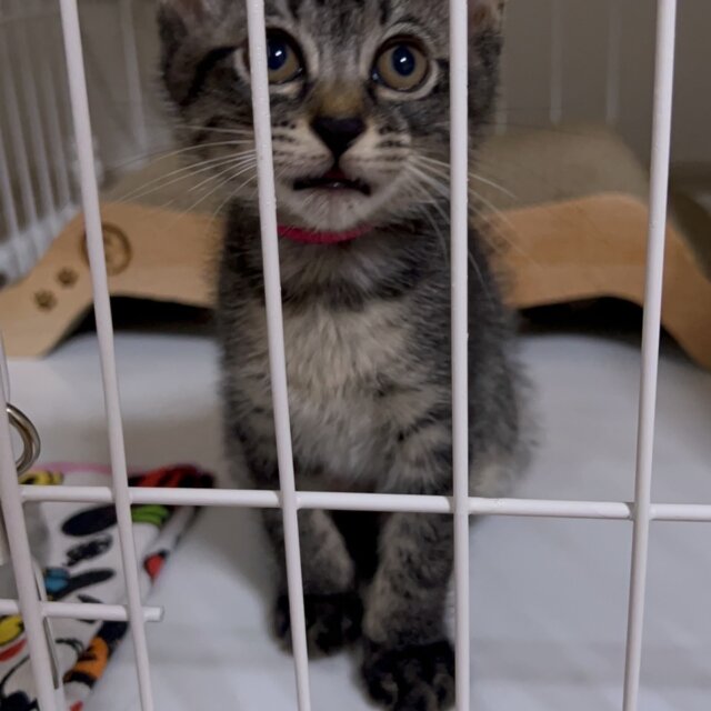綺麗なキジトラの仔猫です。姉妹で預かっていますが、よく食べて、よく遊んでいます。先住猫ちゃんとも仲良しで、一緒に行動しています。ジャンプ力が抜群の元気女子です。ママ猫と一緒に保護したので、おうちで生まれました。