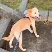 お散歩練習は5月中旬から始めましたが、まだハーネスの装置が苦手です。お散歩とトイレは練習中です。