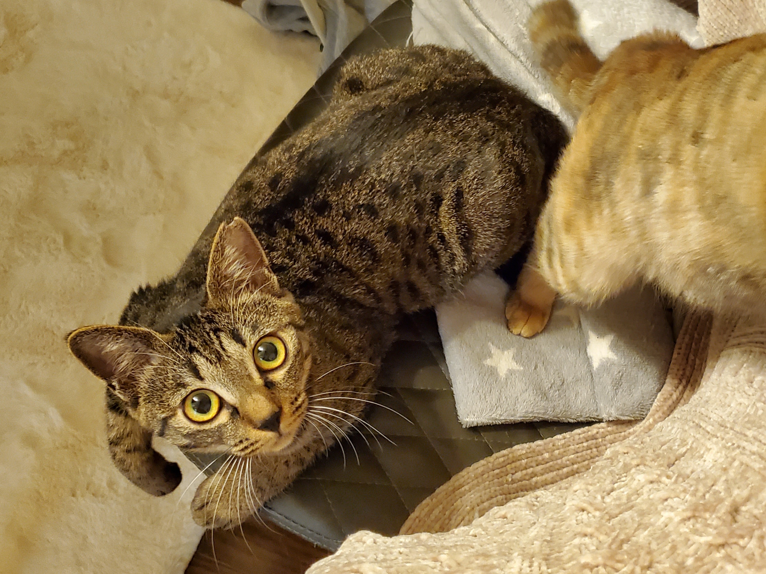 毎日大人猫にちょっかい出したり、仔猫達で家の中を走り回りボールを追いかけたりと、とても子供らしく元気です!