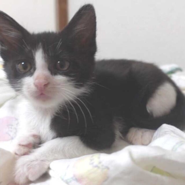 大変かわいらしい黒白ハチワレ美人の子猫の女の子です。