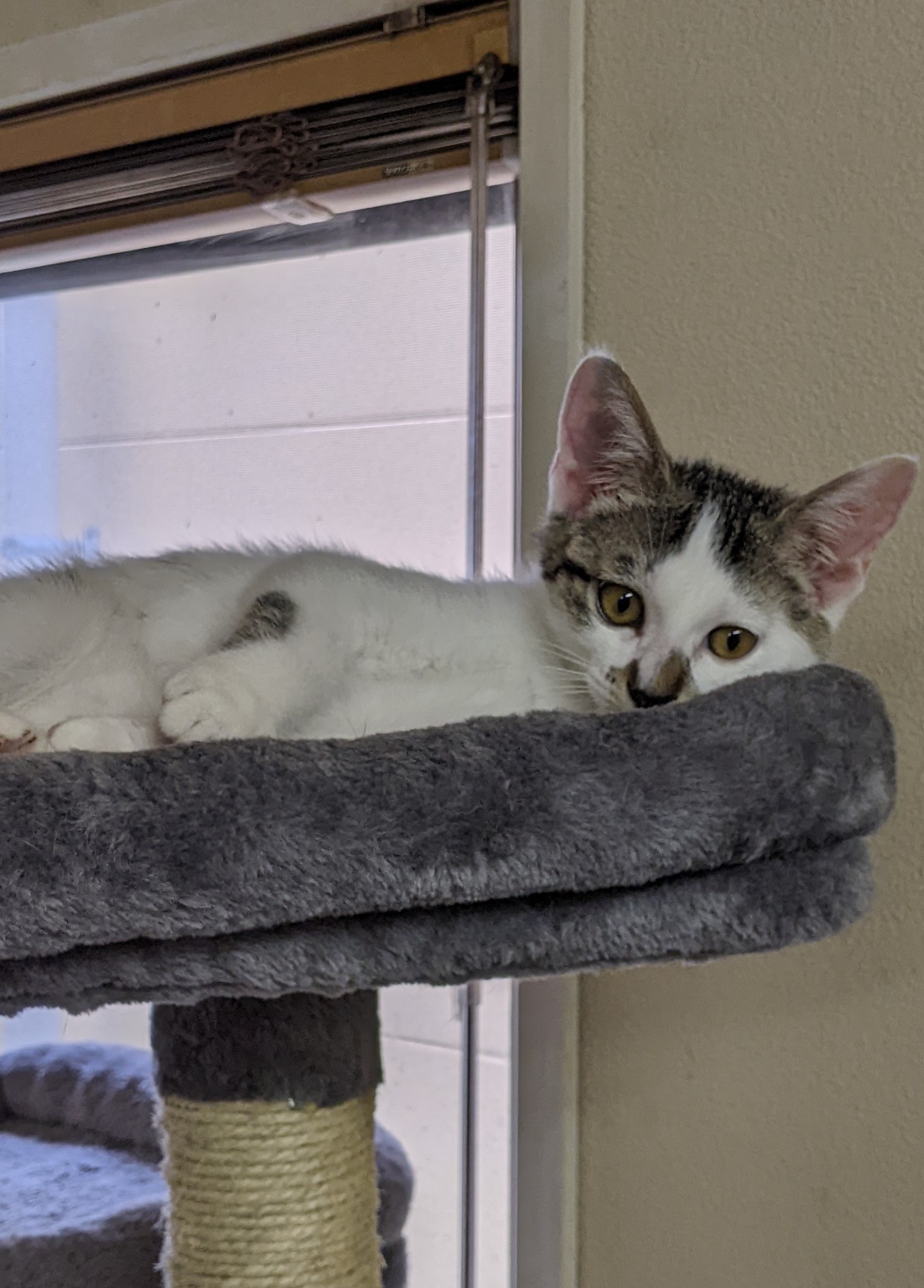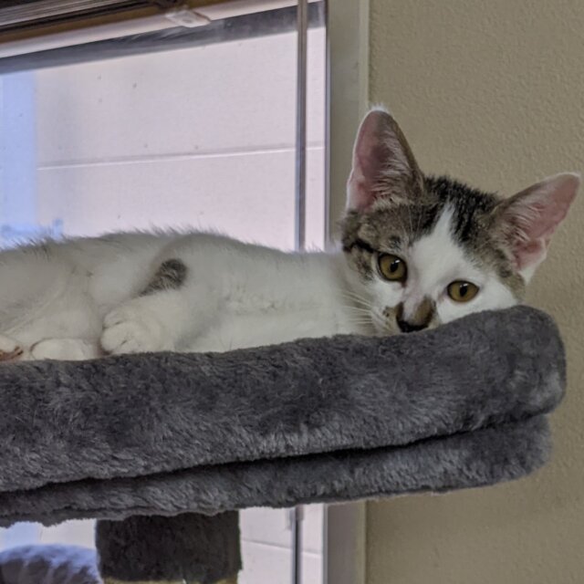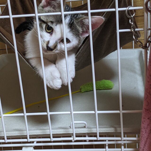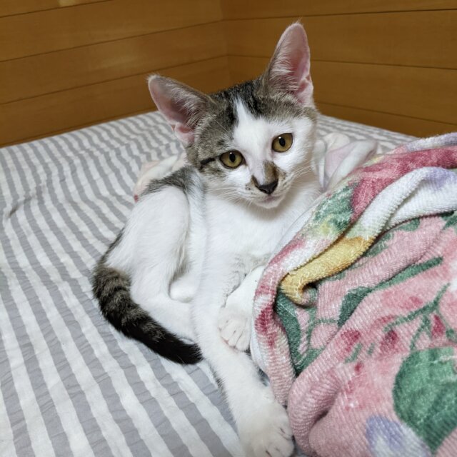 ママと3きょうだい、屋根の上で暮らしていました。カラスに襲われる危険があったため、みんな保護し、ママは避妊してリリースしました。3きょうだいのうち2匹は同じおうちが決まりましたので、このコにも最高のおうちを見つけてあげたいです。