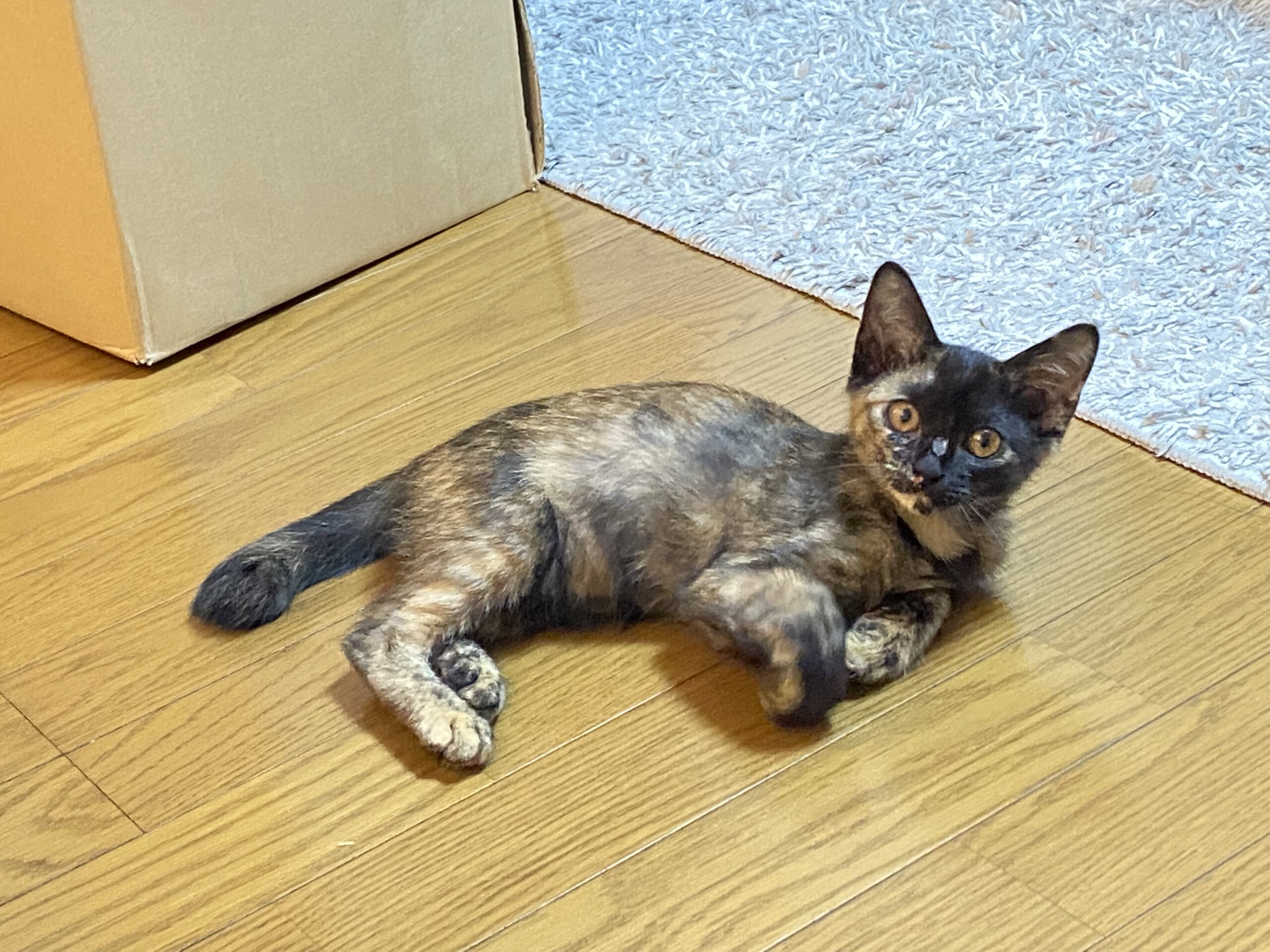 母親がいるかもと餌付けだけして様子みていましたが、母親は現れず玄関に居着いたため保護しました