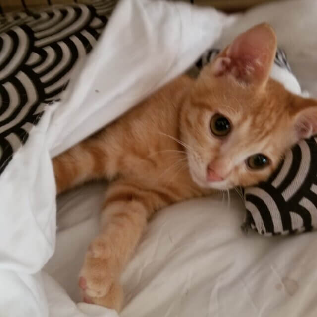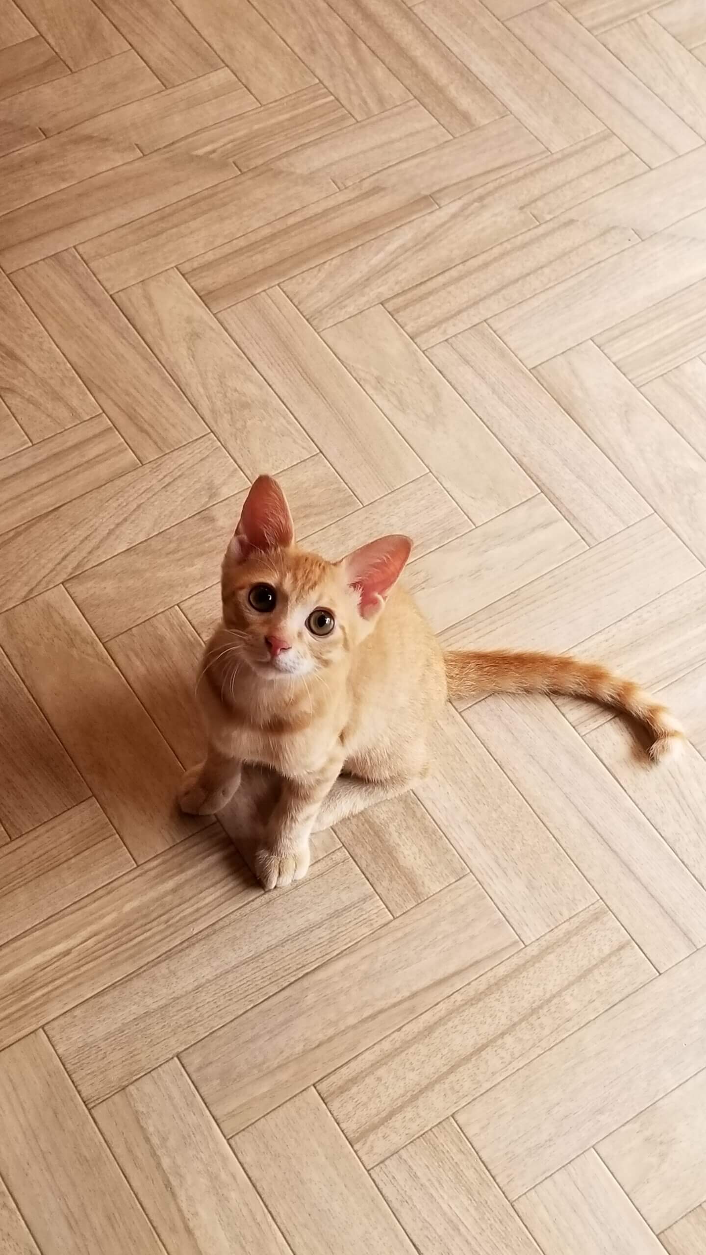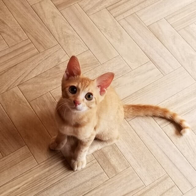 幸運のカギしっぽをふりふりする、元気な茶トラくんです。