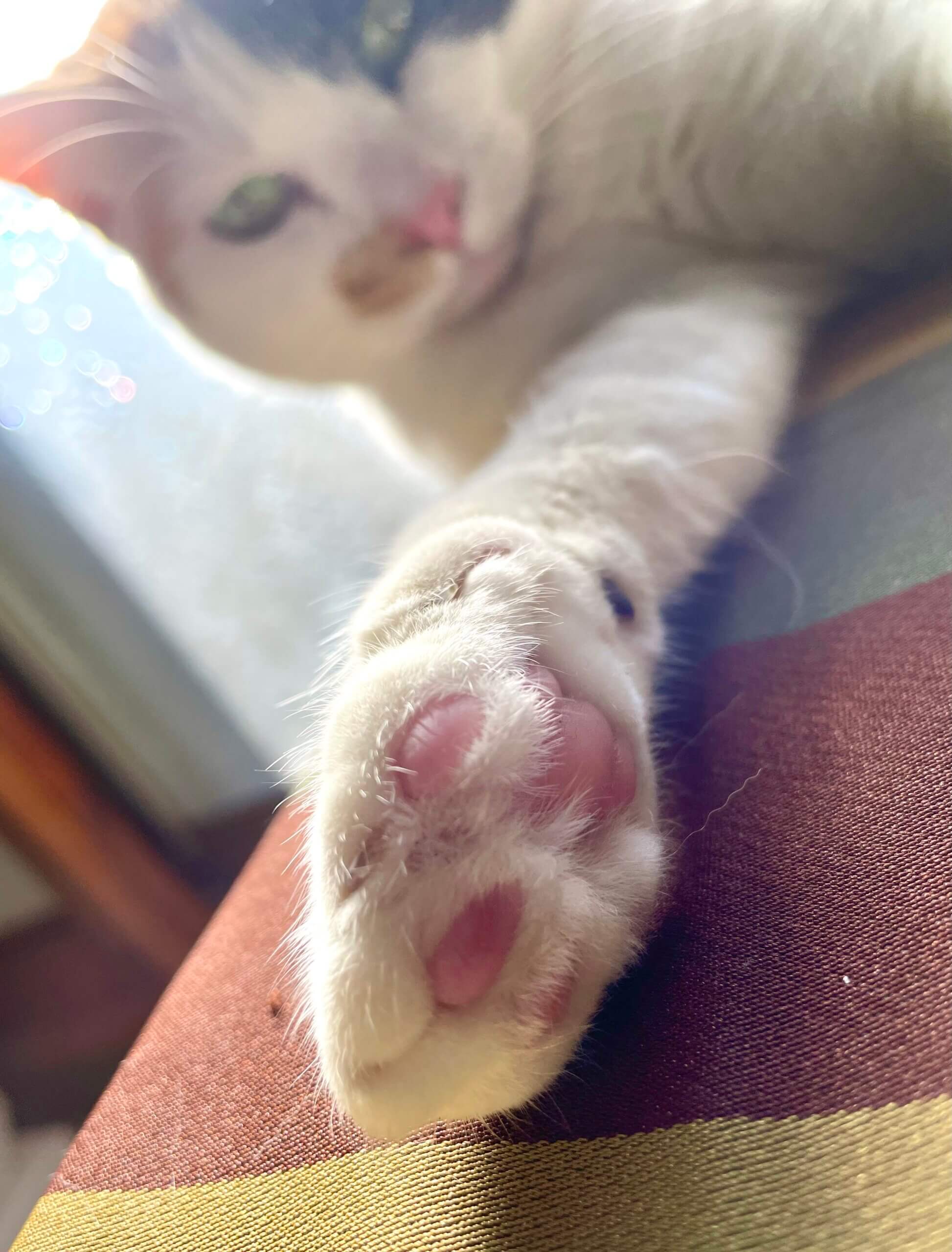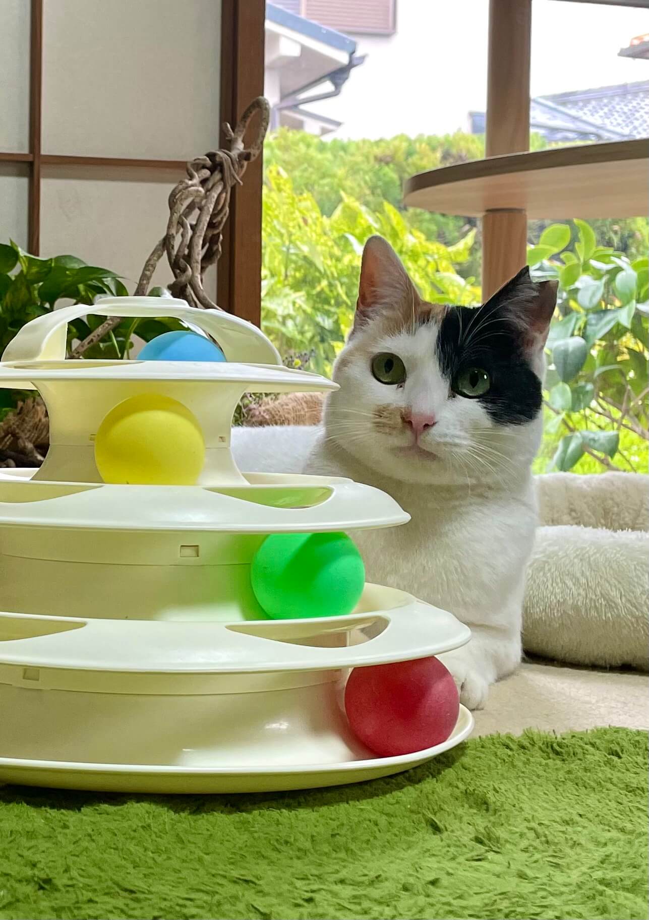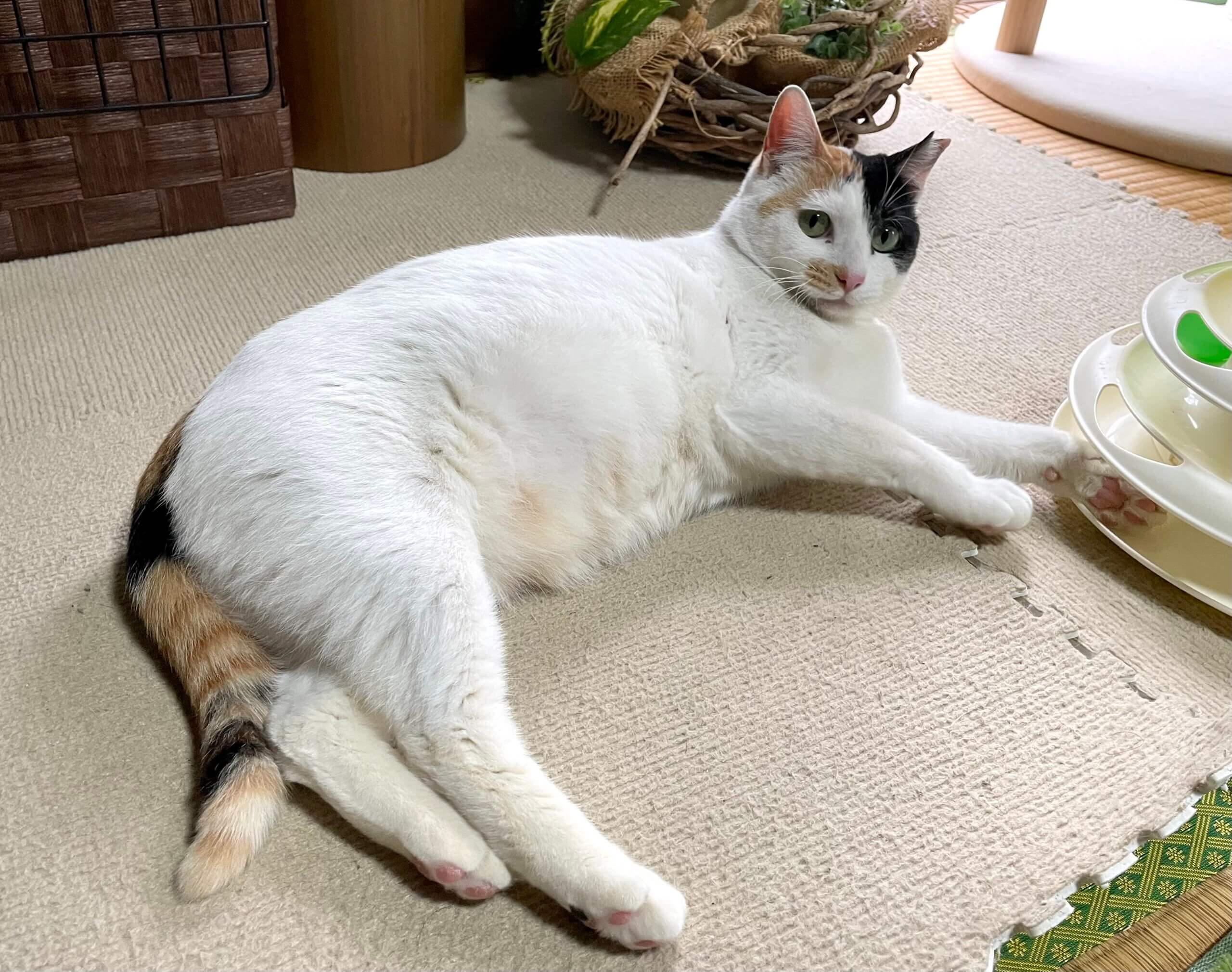 とにかく可愛くまだ子供のような子で、かわいいもちふわちゃんです。オモチャが大好きで1人遊びも出来ますが、寂しがりやさんです。家には保護猫3匹がおり、相性が良くないので仕方なく三毛ちゃんは独りで部屋にいます。。自由に過ごせるずっとのお家で幸せになってもらいたいと考えています。