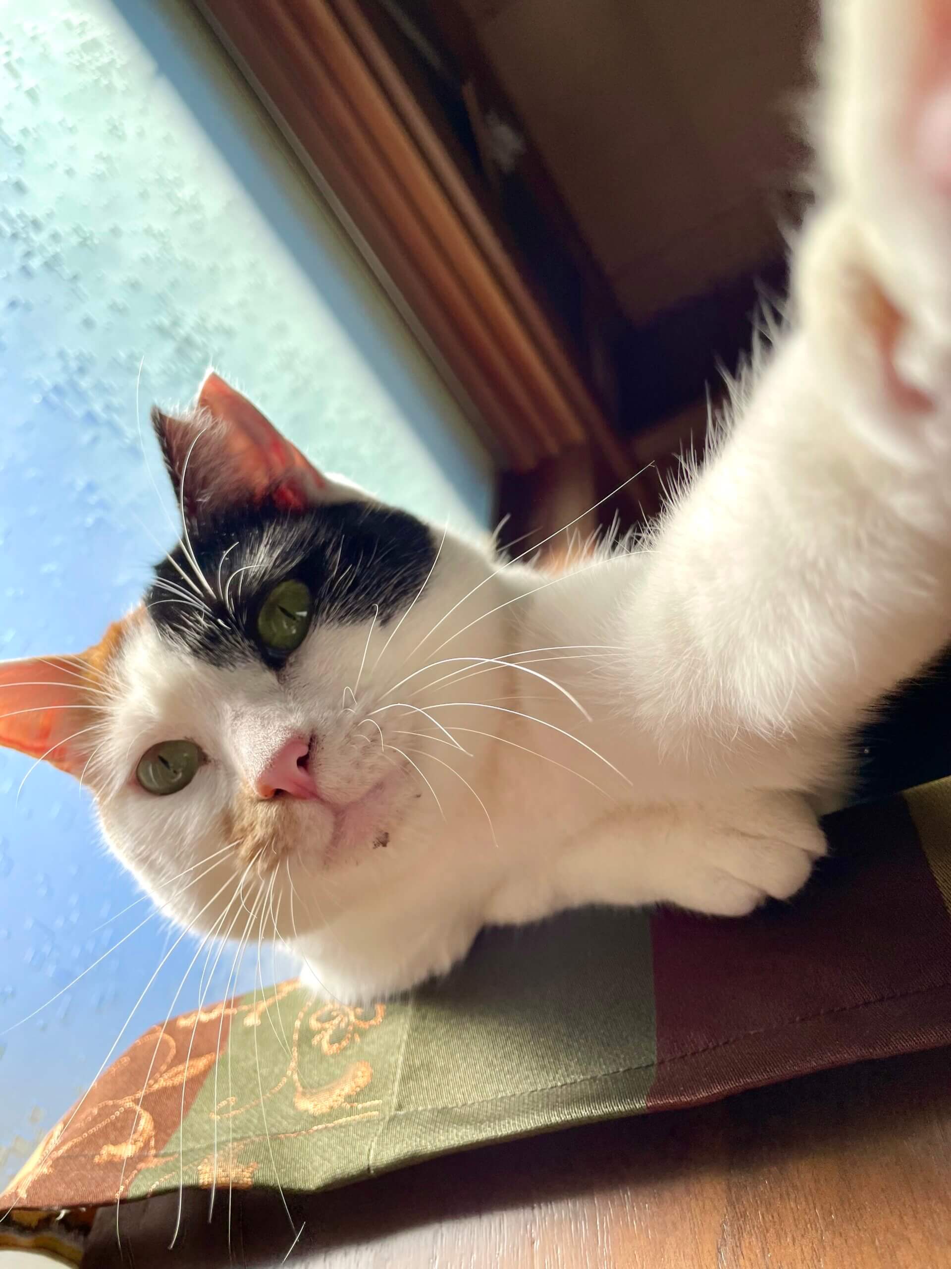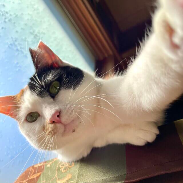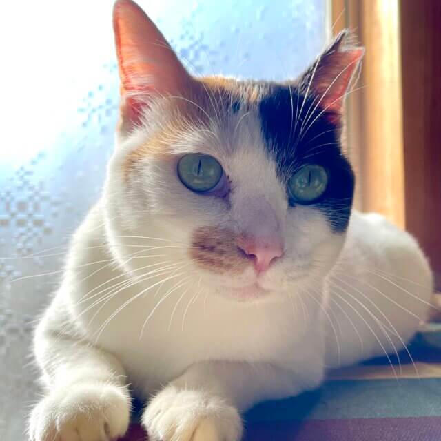 子供の頃から近所で生活していたのですが、昨年うちの庭に来るようになりTNRをしたところ、既に授乳中だと判明。その後4匹の赤ちゃんを連れて再び家の庭に現れました。先にその子猫たちを保護して育て4匹共里親様に譲渡しました。その後人好きなミケちゃんは庭猫となり、懐いてくれたため保護に至りました。当時まだ本人も幼さが残ってましたので、今も生後1年数ヶ月位と推定されます。