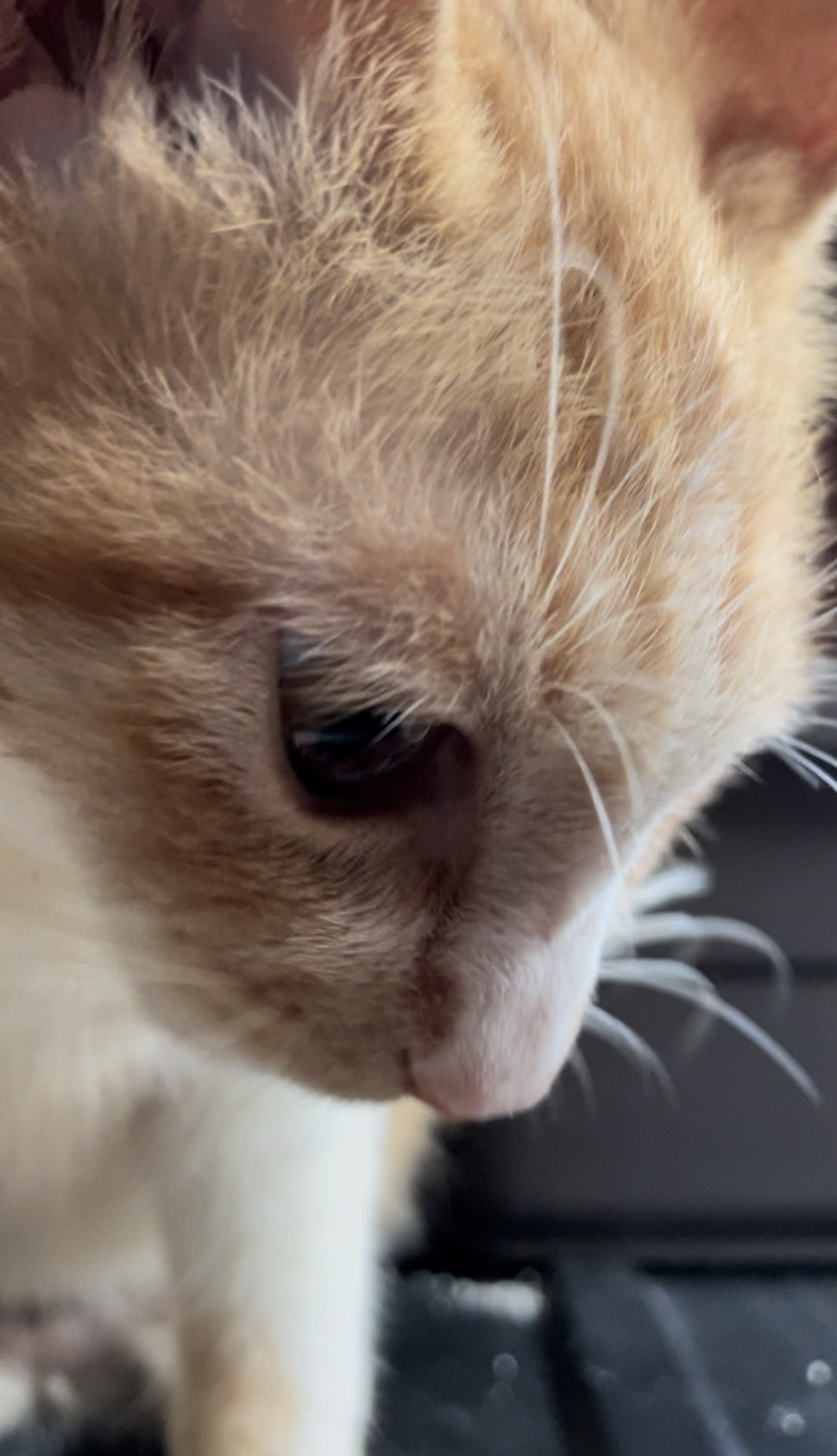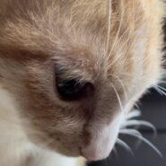 しっぽは長く、薄い茶色がとても綺麗な茶白猫です。