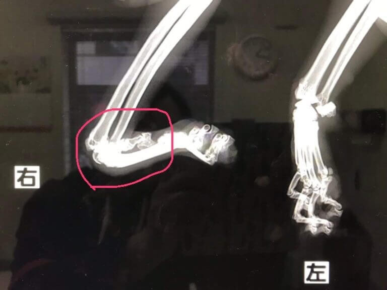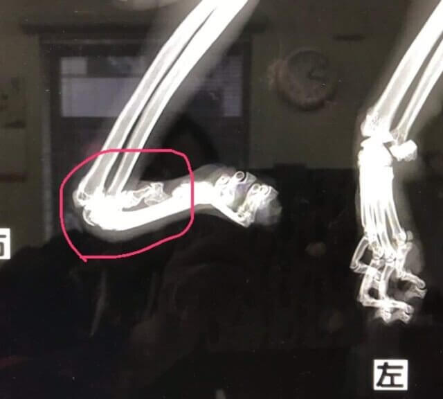 右前足が屈曲しています。先天性なのか虐待なのか?元のご依頼主様も原因はわからないそうです。