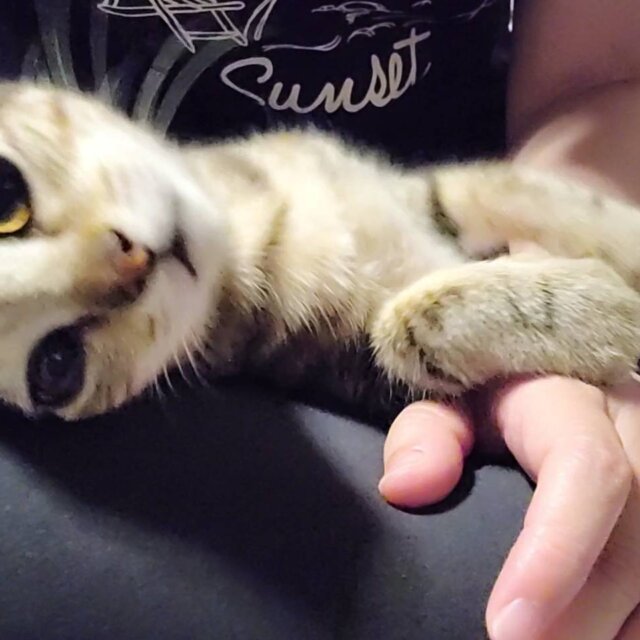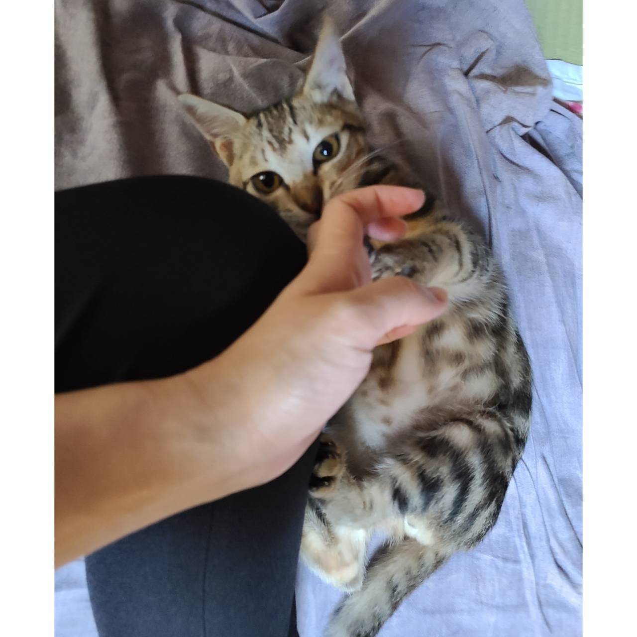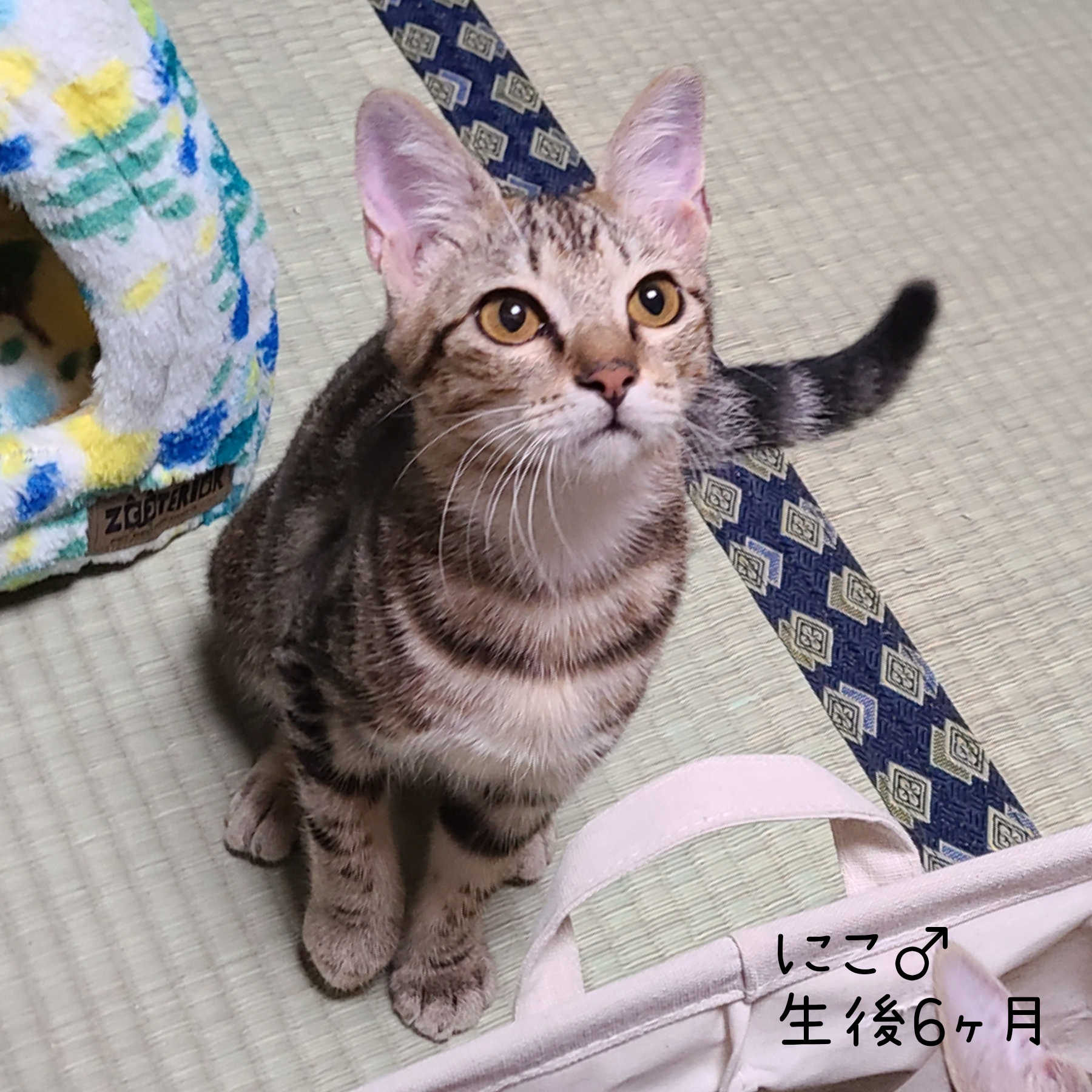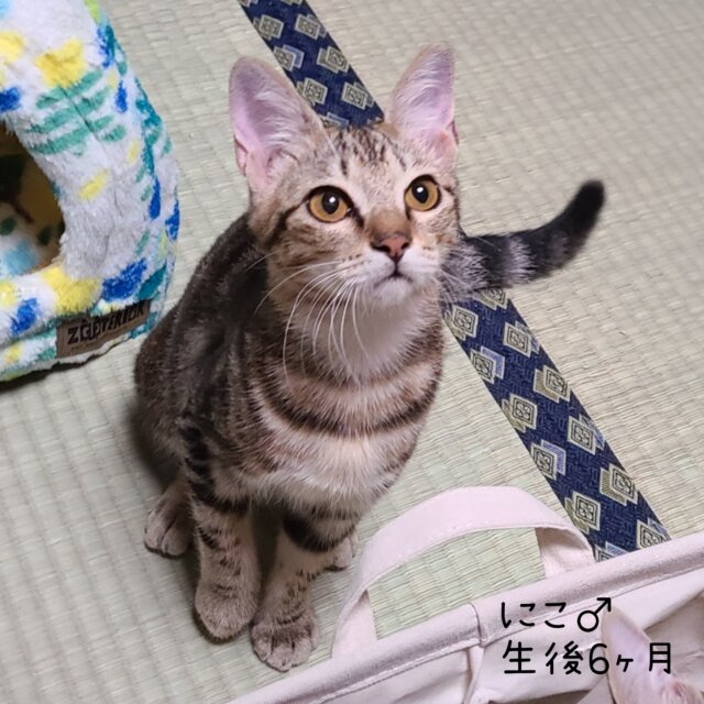 人と遊ぶことも、猫と遊ぶことも大好きなやんちゃな子猫です。預かりさん宅に新入り猫ちゃんが加わった時も嬉しそうに「僕、にこだよ!初めましてー」と言っているかのように挨拶に行き、優しく遊びに誘っていました。