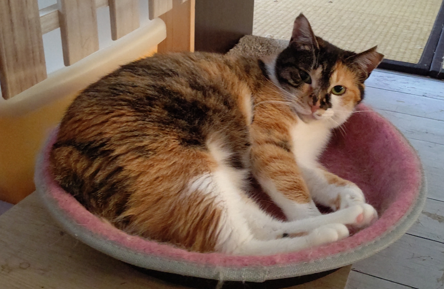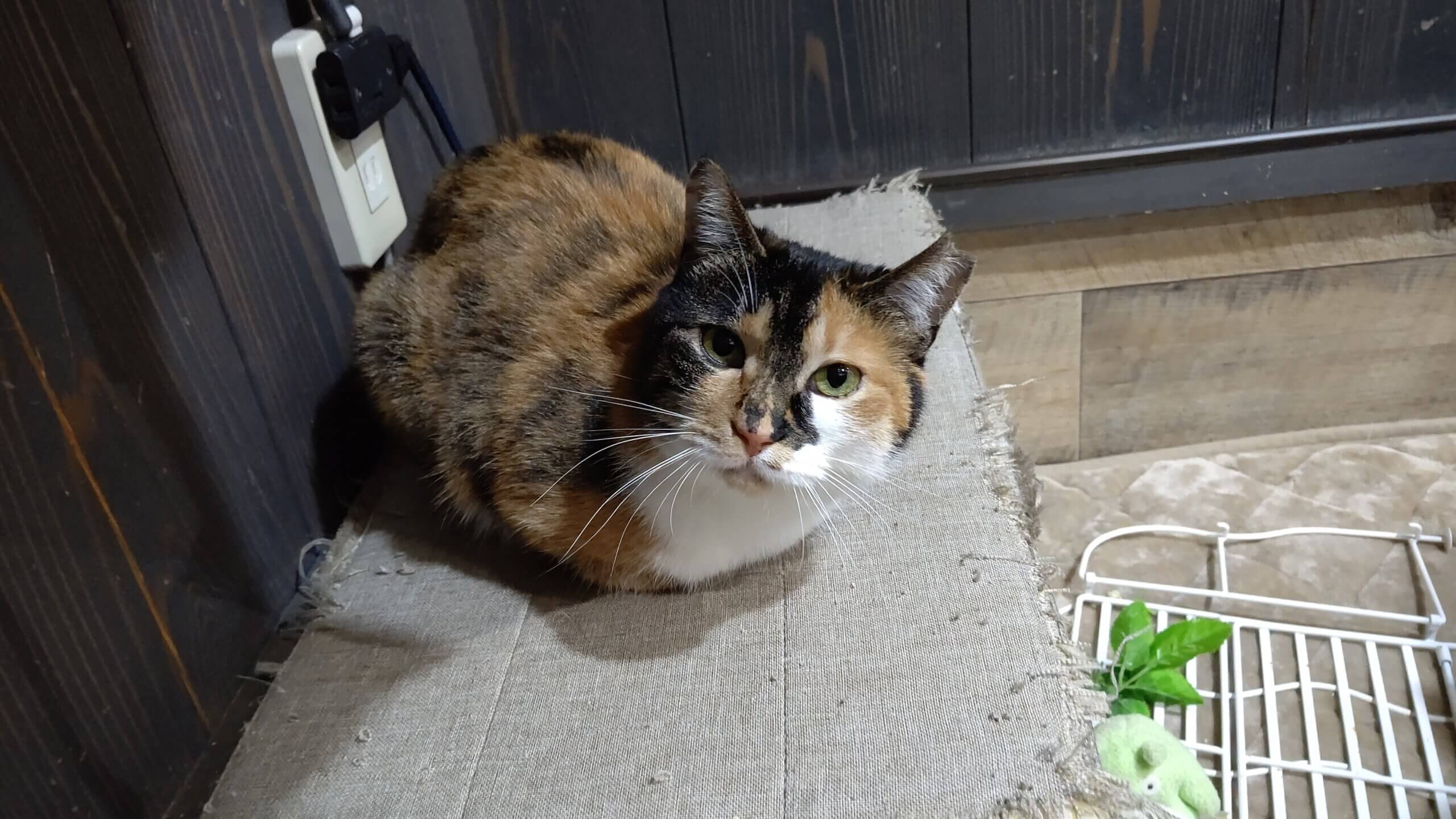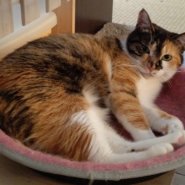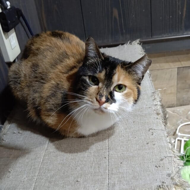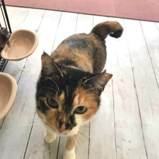 目がくりっとしたキュートなお顔の三毛猫さん。性格はびびりさんです。