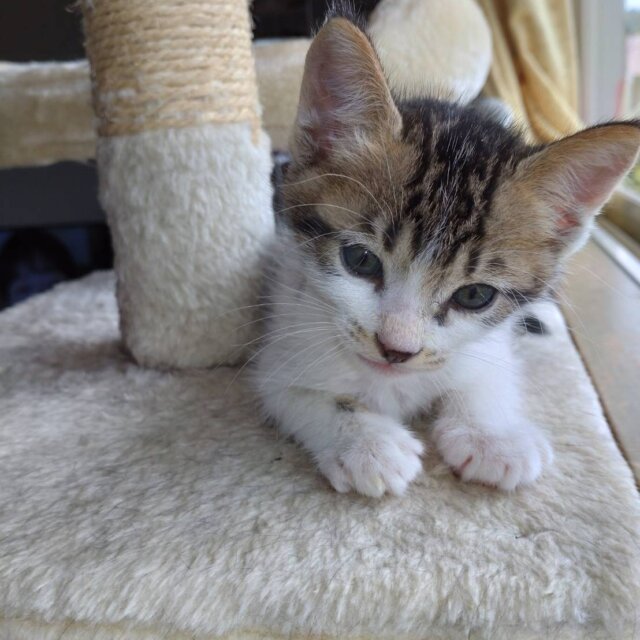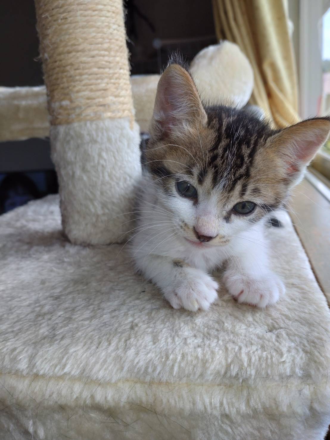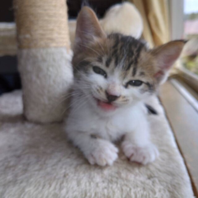 4兄妹の中で一番大きく、他の仔猫にちょっかい出していますが、ご飯の時には一番に飛んできます。