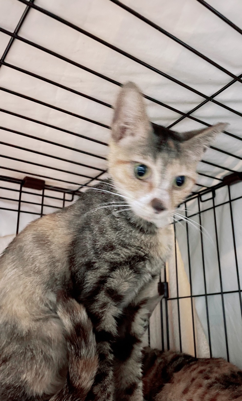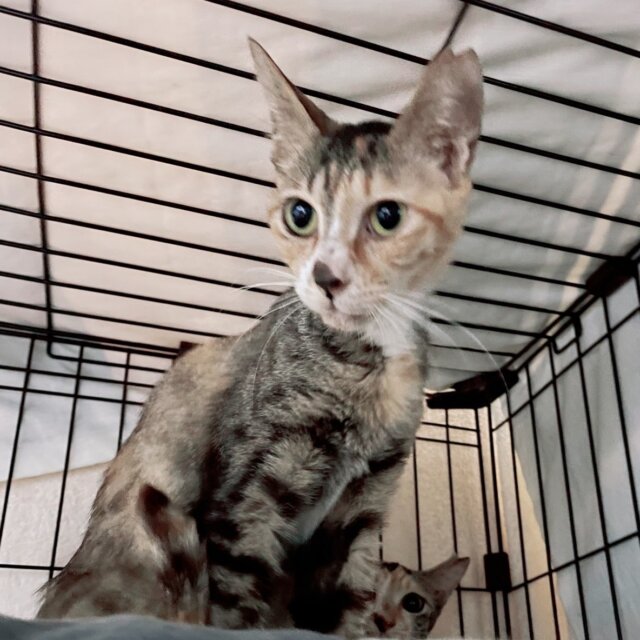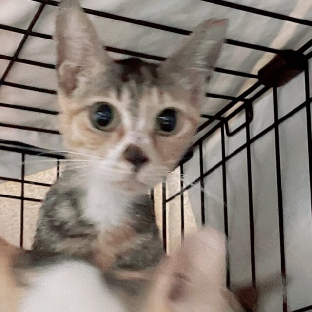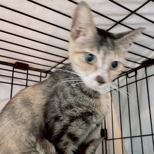 甘えん坊のとても可愛い三毛猫です。模様がキジ白のようにも見える特徴のある三毛猫ちゃんです。