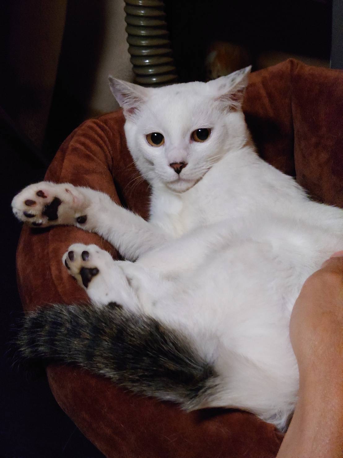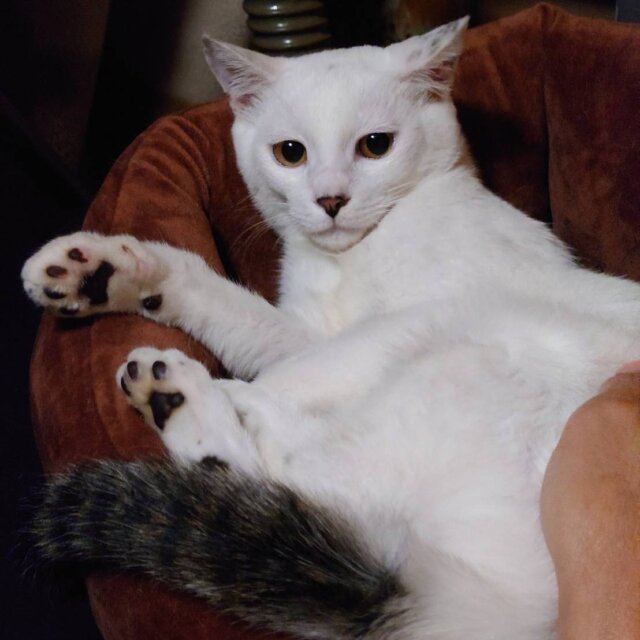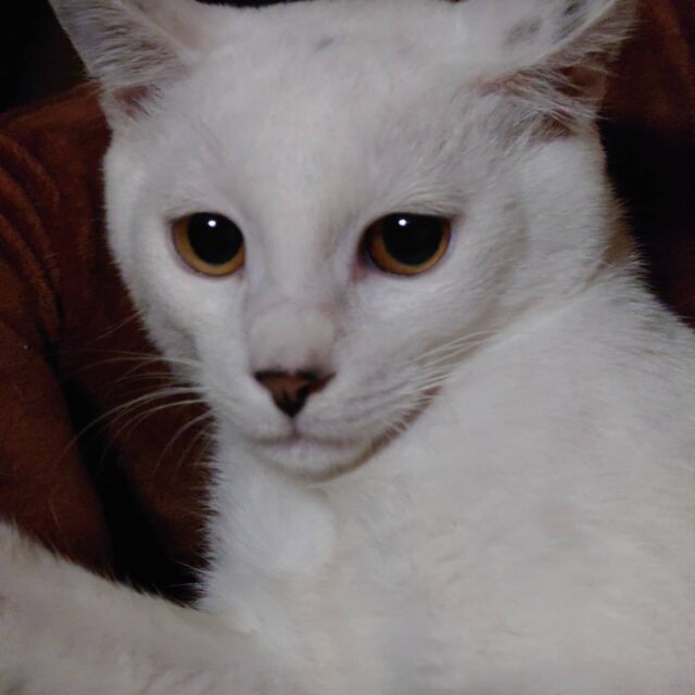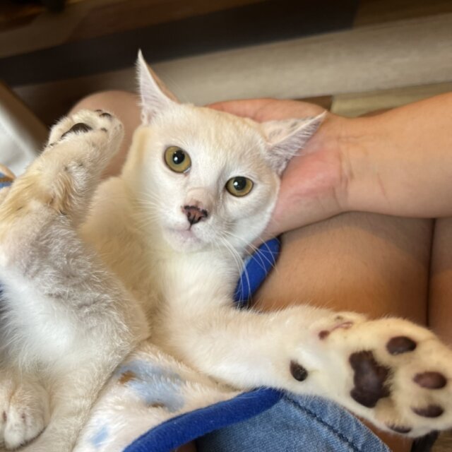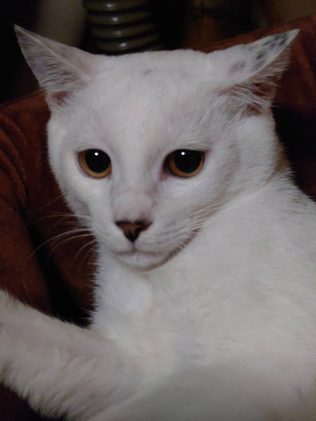 耳の黒い斑点は模様です。抱っこ好きのビビりです。