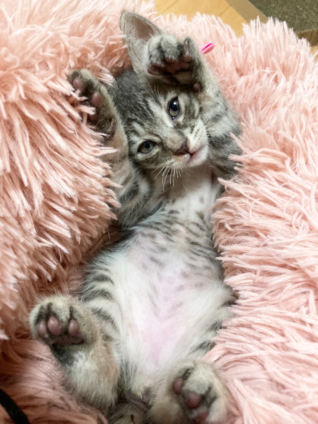 手足とお腹には分かりやすい縞の柄が入っています。背中側は、グレー1色に近い毛色です。兄妹に茶トラ君がいるせいか、お顔にはうっすらライトブラウンが混ざっているような色味です。