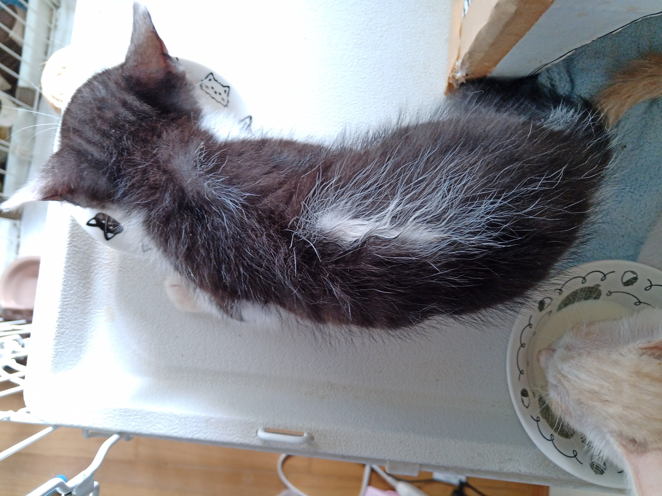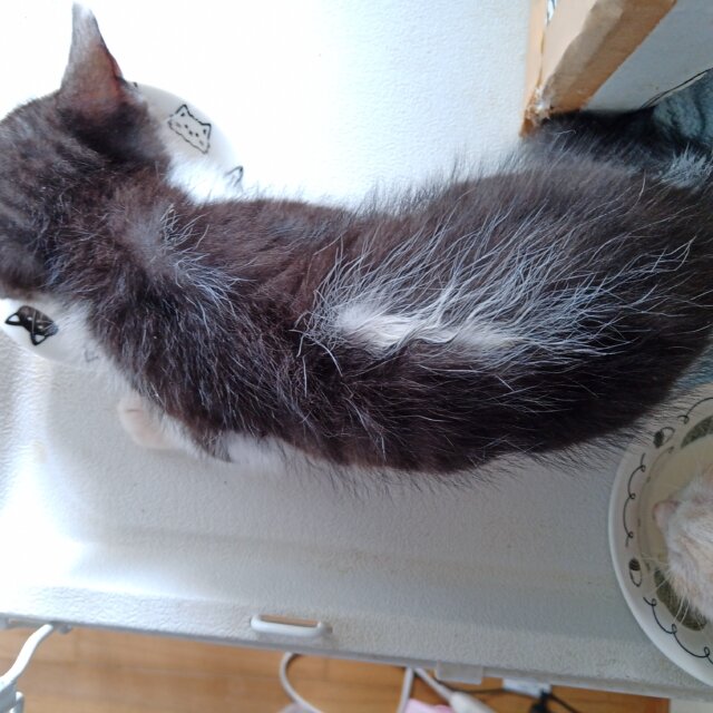 背中に長い白毛があるハチワレ子猫です。