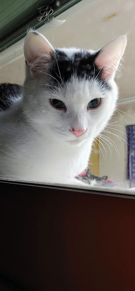 控え目で少し臆病な性格です。ママ猫としまさんがおもちゃや紐で遊んでいるのを見ていて、二つが飽きて退散すると時間差で一人遊びだすことがあります。