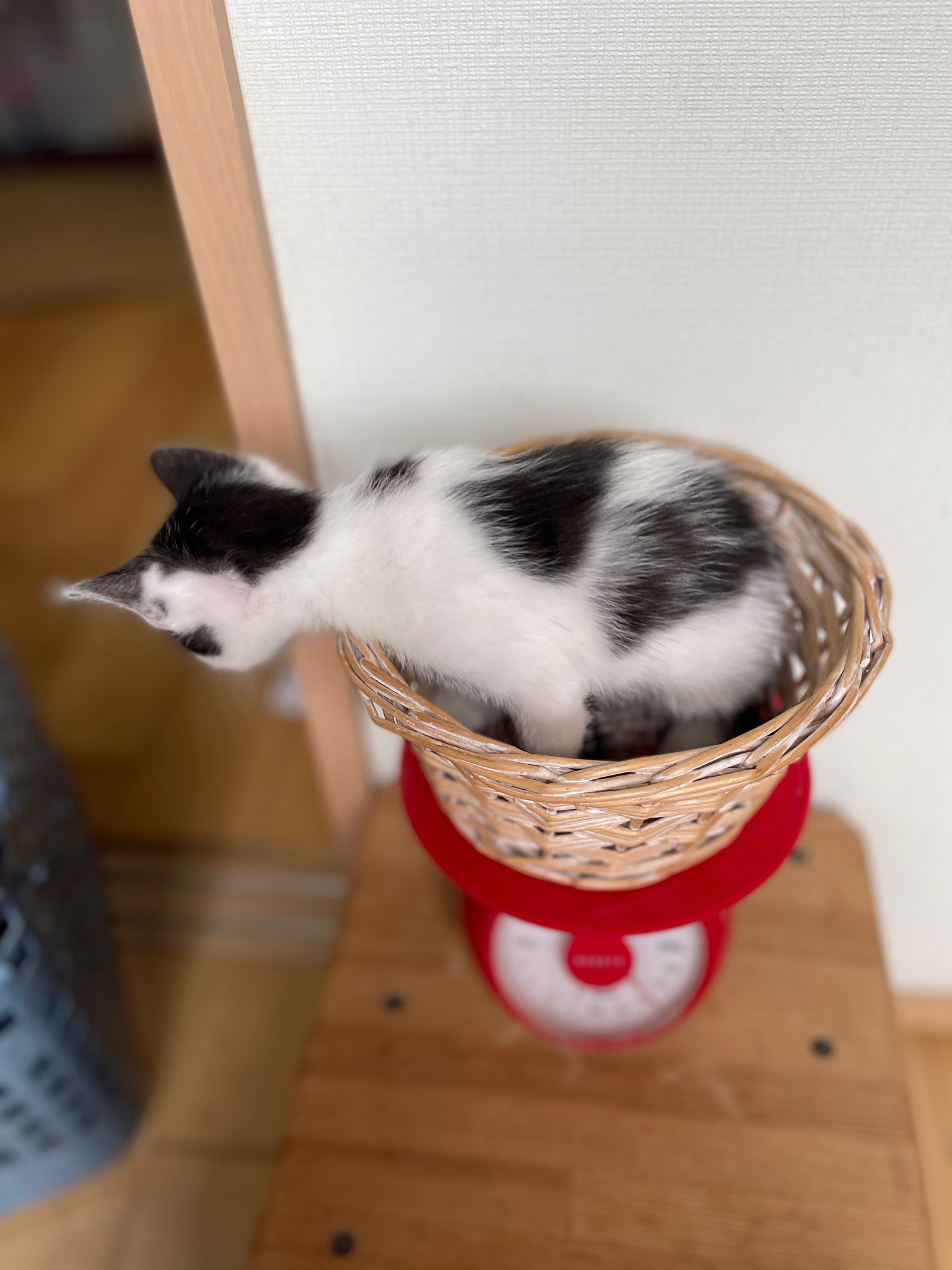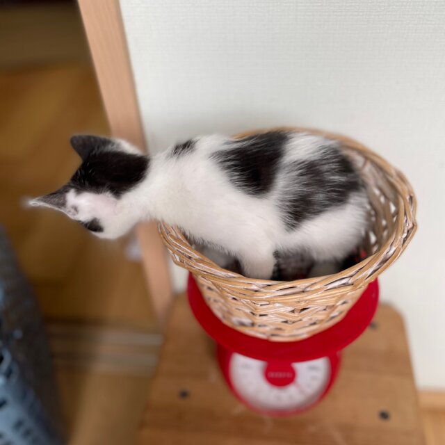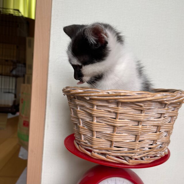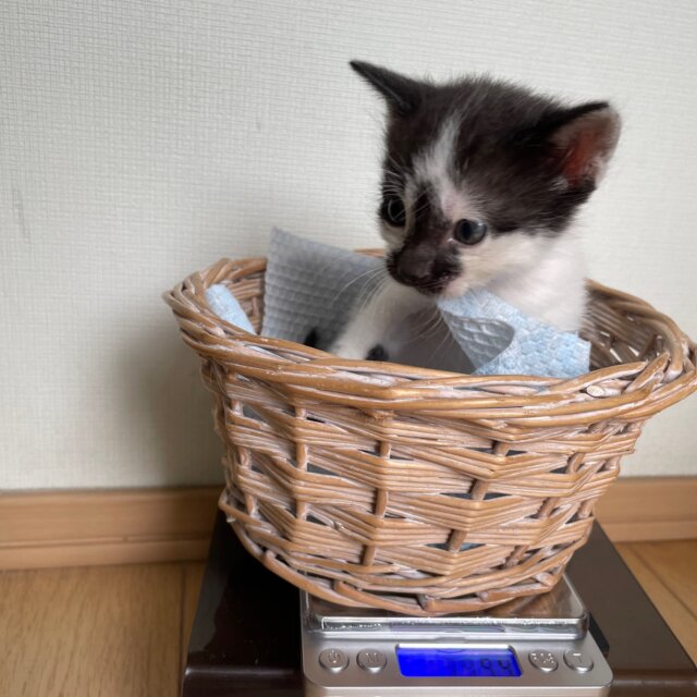 9/1生まれの生後約1.5ヶ月、体重は約650g、ウシ柄の男の子で尻尾は真っすぐです