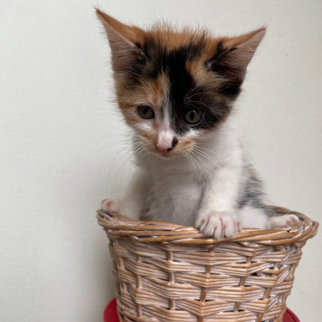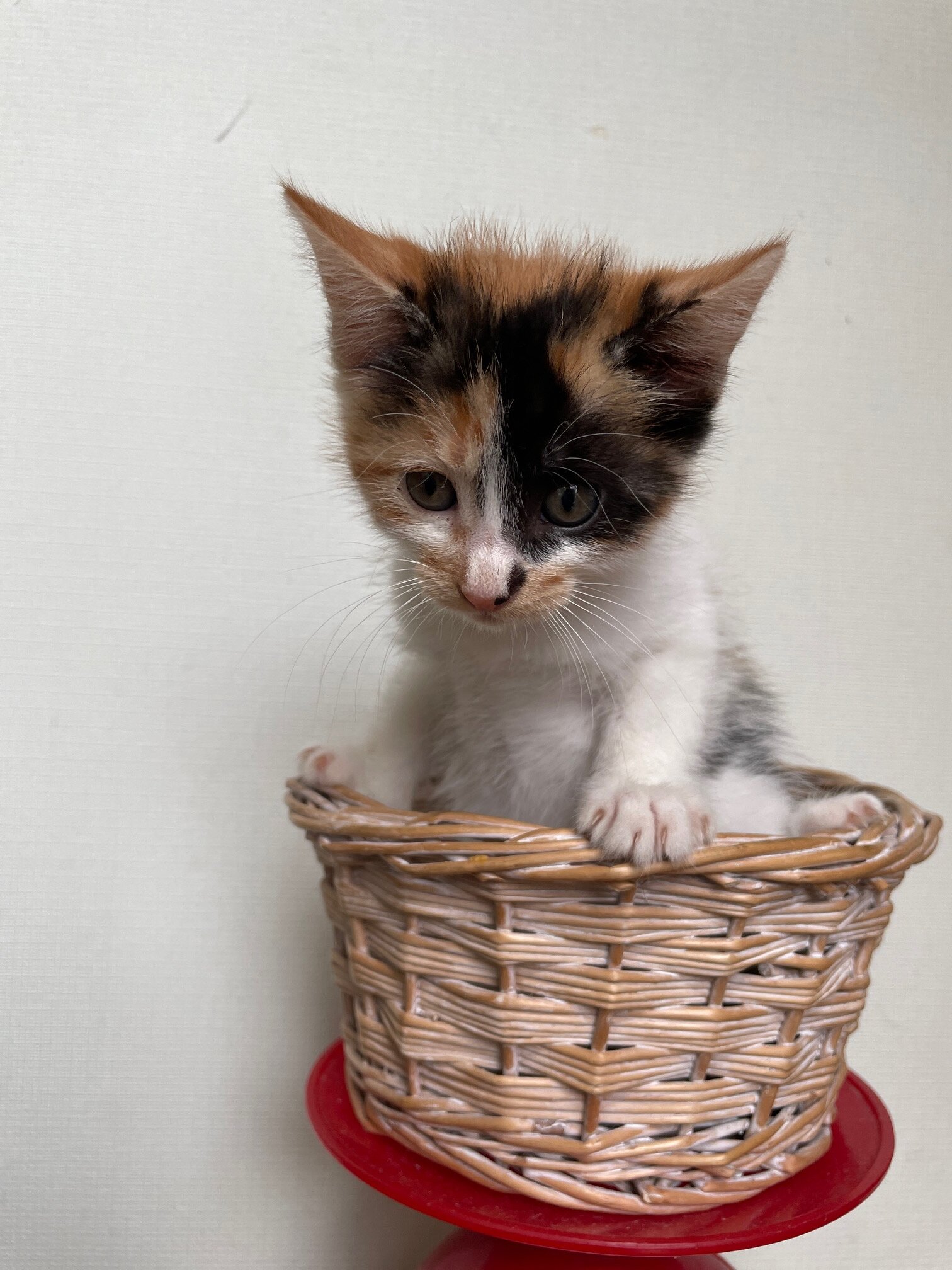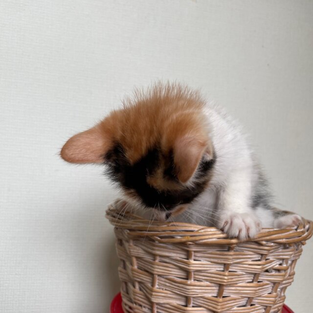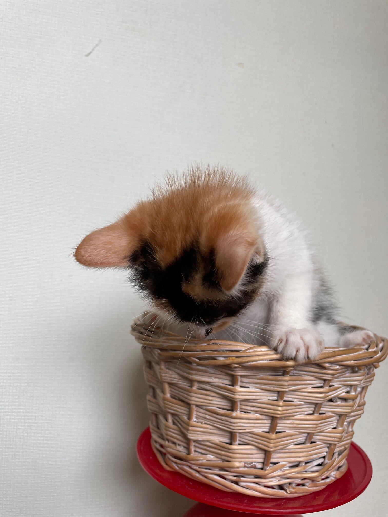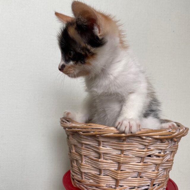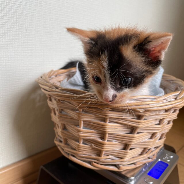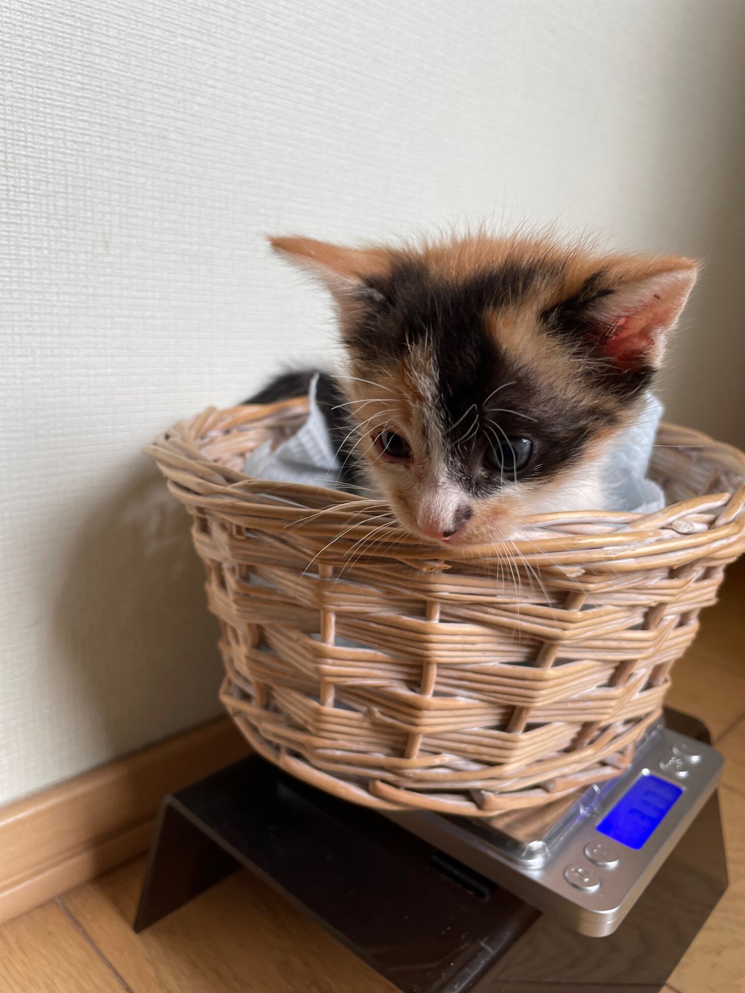 9/1生まれの生後約1.5ヶ月、体重は約650g、ミケの女の子で尻尾は真っすぐです