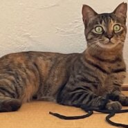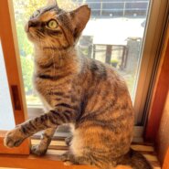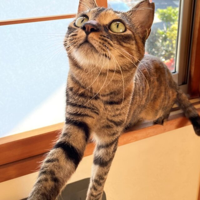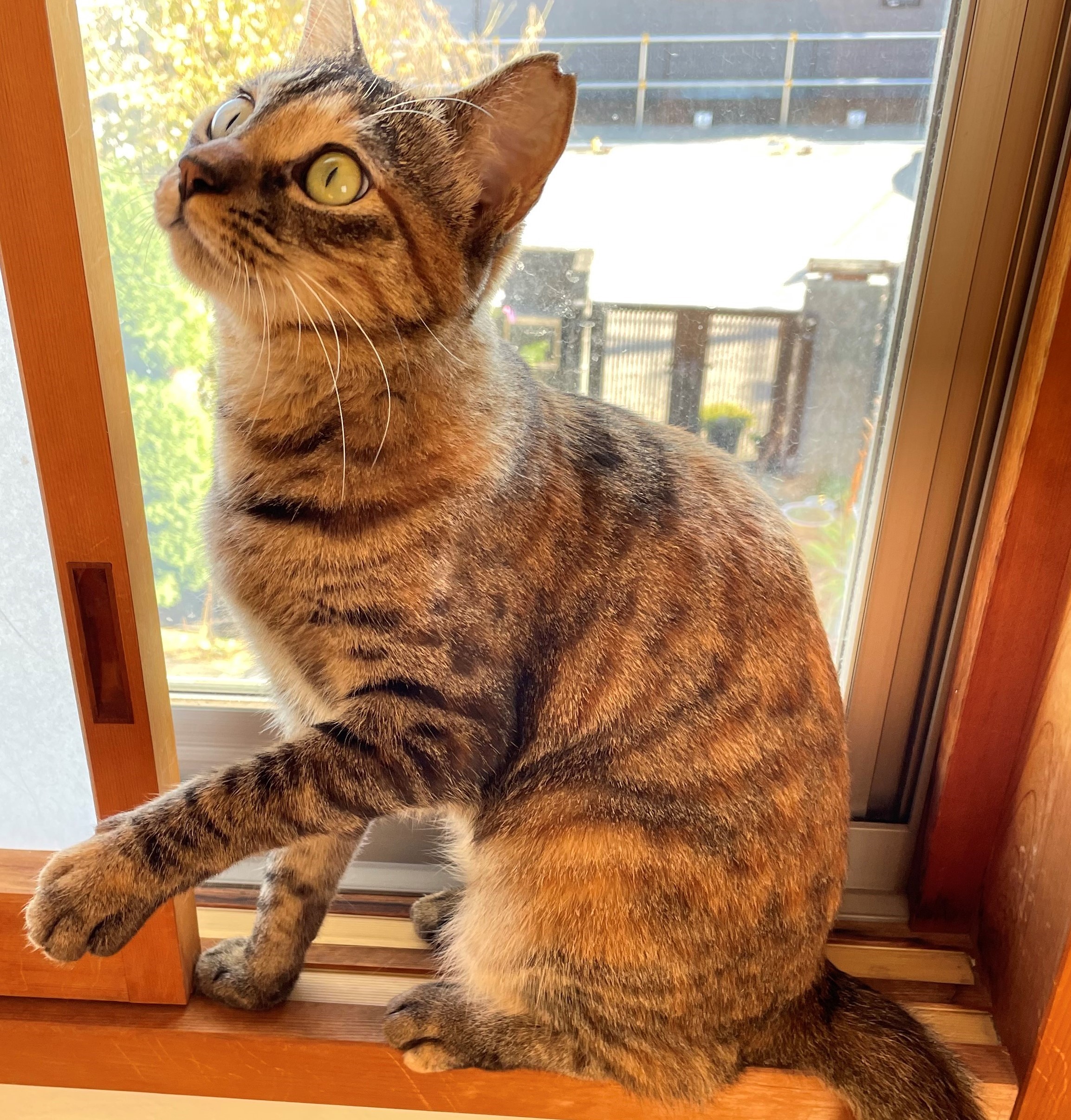 写真では一見キジトラですが、背中部分にほんのりオレンジが入った不思議な色合いの足長美人さん。
