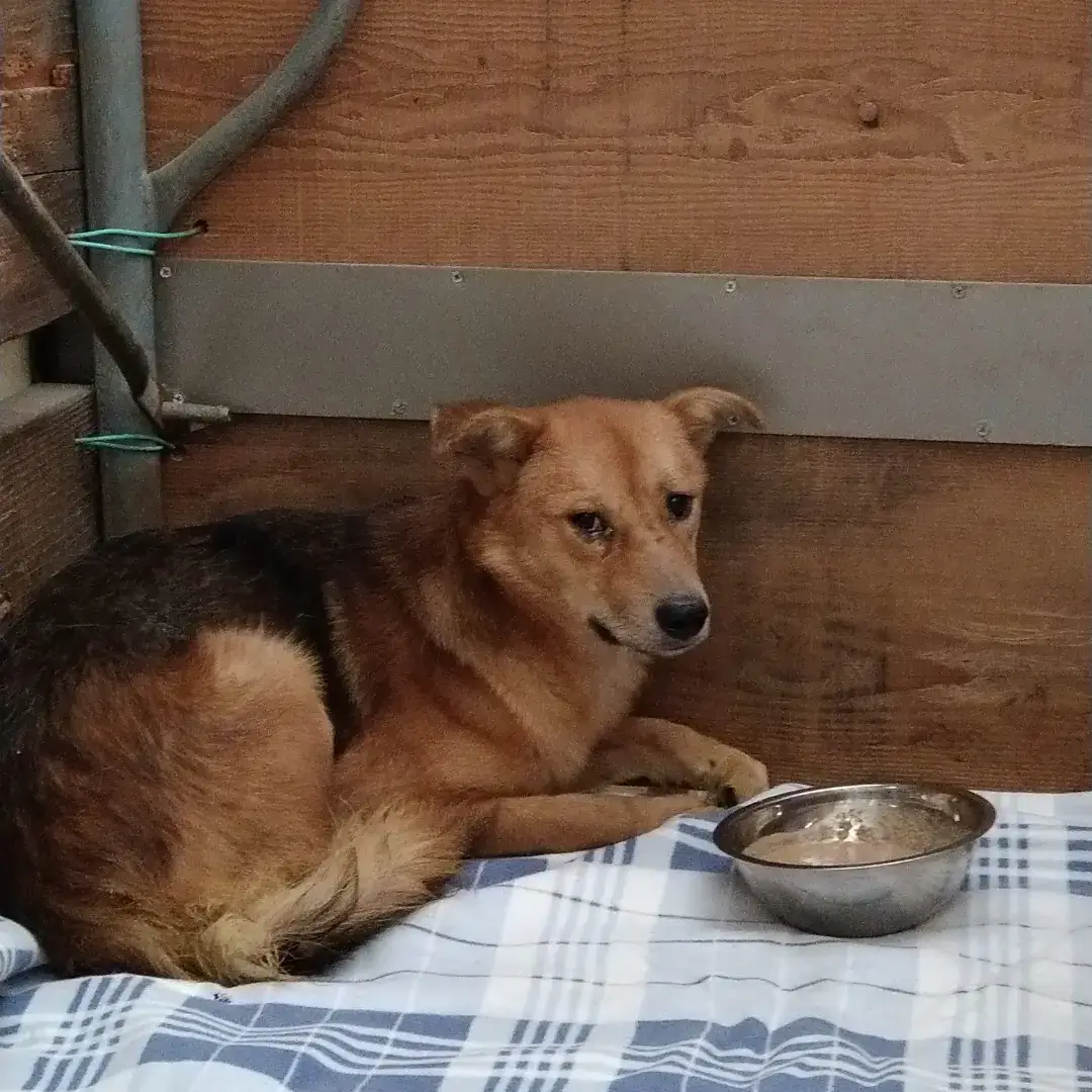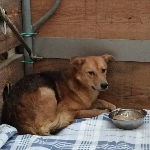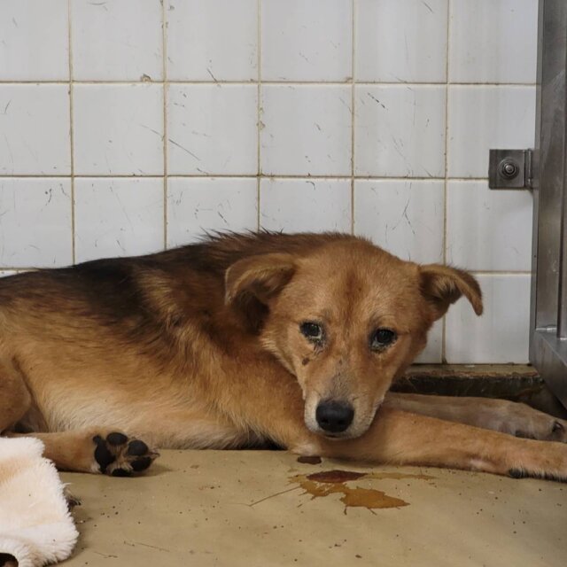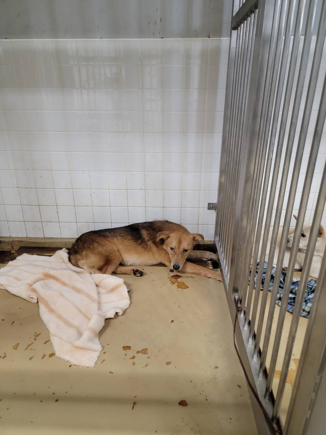 写真。3枚、4枚目は保護団体に着いてからのこの子です