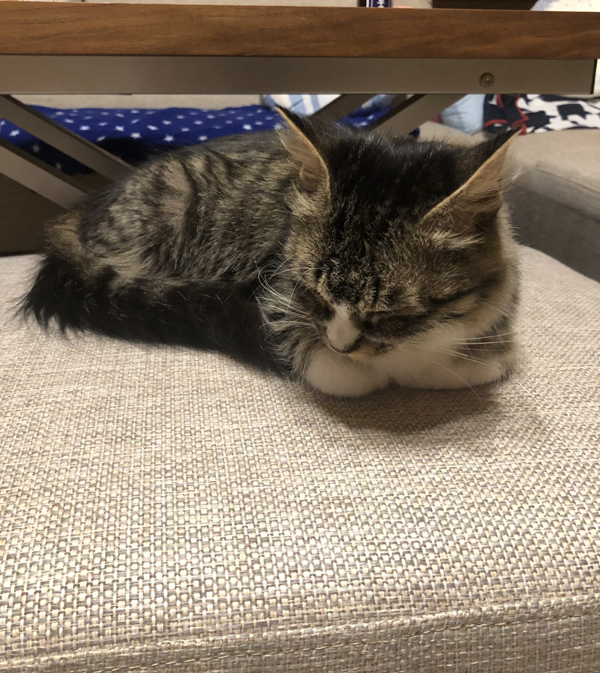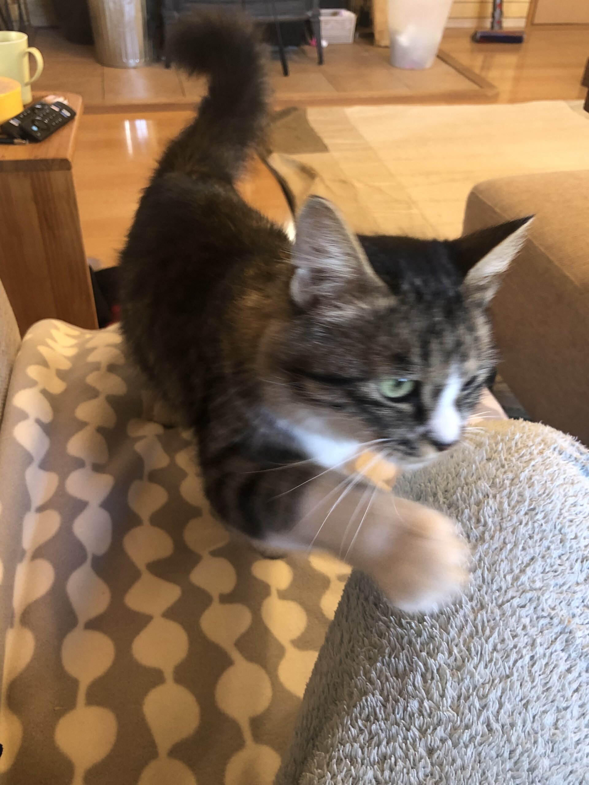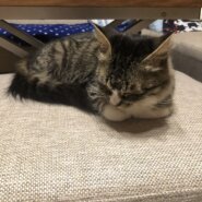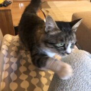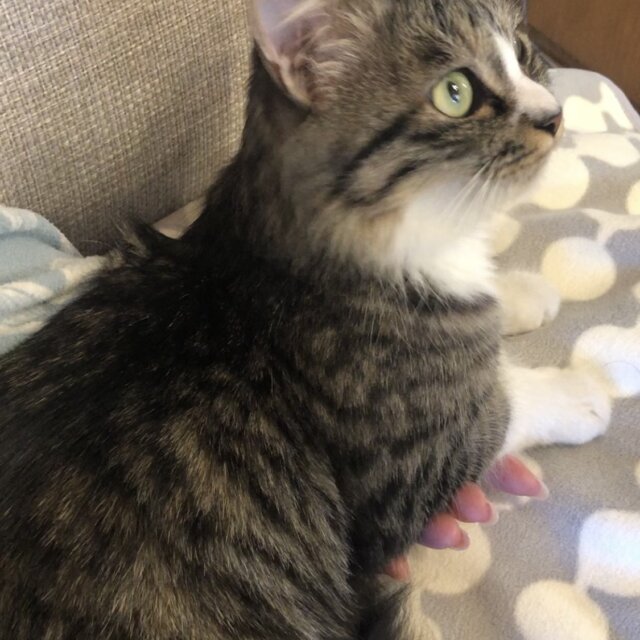 何処へ行くにもこの子が寝ていても立ち上がるとあとをついてくる寂しがり屋さんです。まだ小さいため、ずっとついてきて踏みそうになります。洋猫特有の気が強い?傾向があるのか、後から来たのに先住猫を追いかけたりしますので、多頭飼いには向かないと思います。