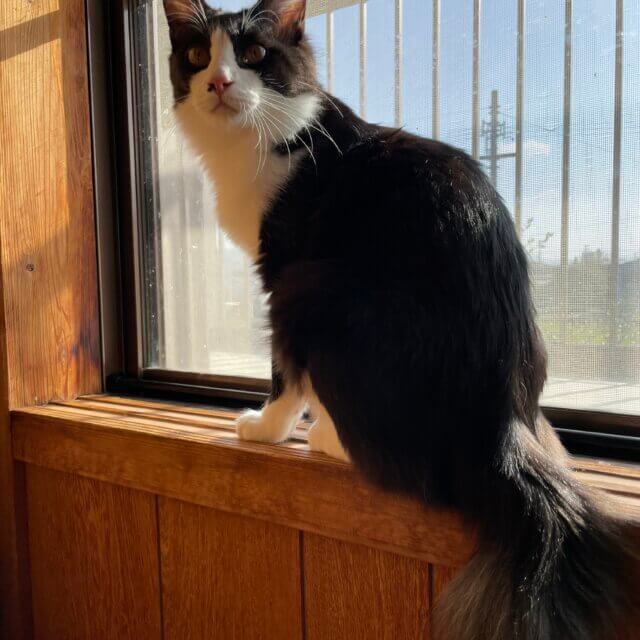 艶々の毛なみの黒白ハチワレ猫