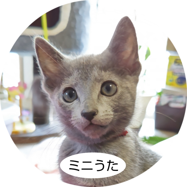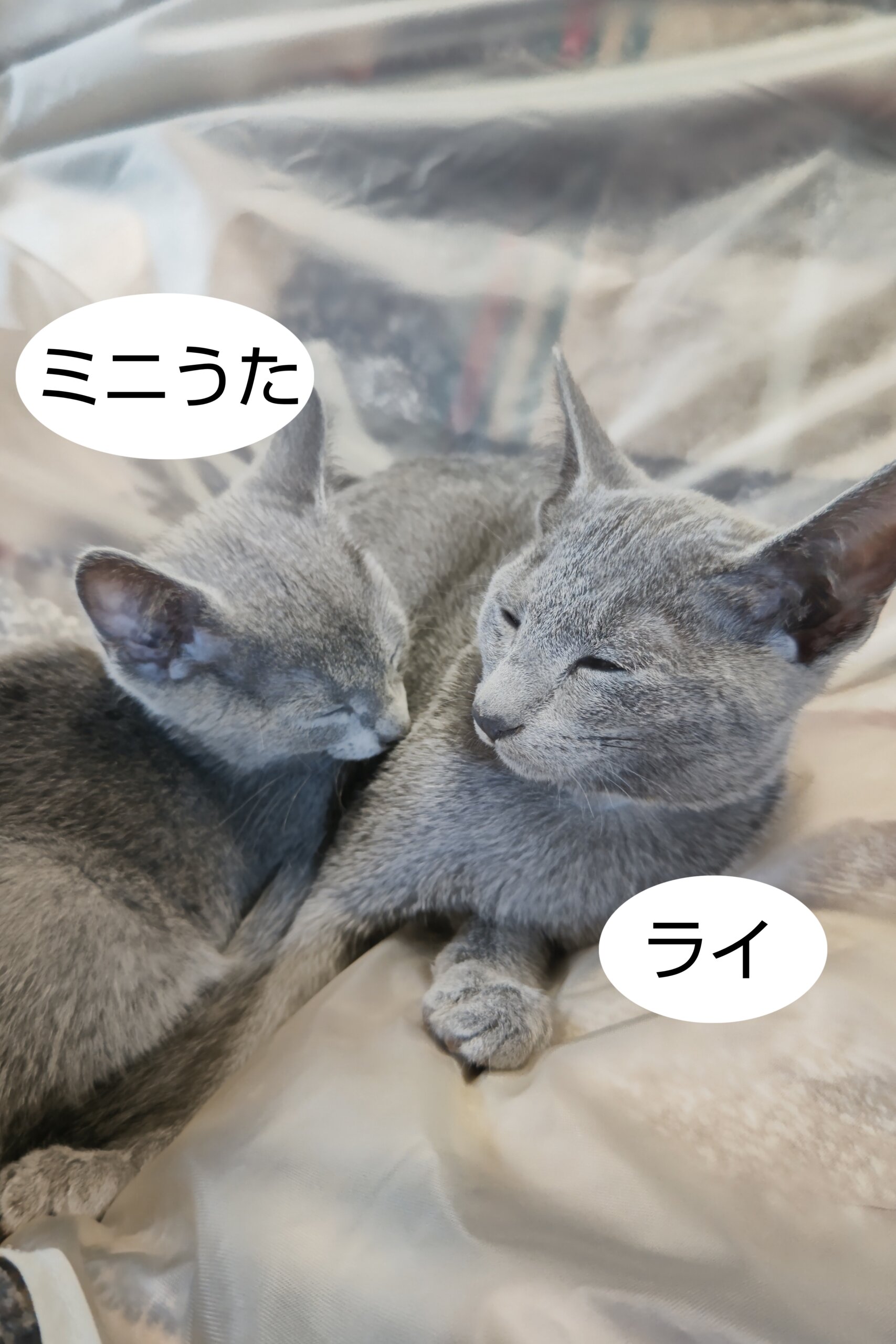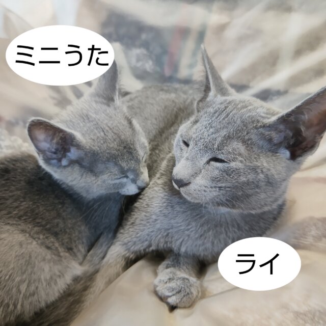 ミニうたは、まだ小さいので、落ち着きがなく、元気いっぱいで、かけっこして遊ぶのが日課です。掃除機が苦手なので、逃げ回ります。ライが膝の上で寝てる時、一緒に寝に来る時があります。