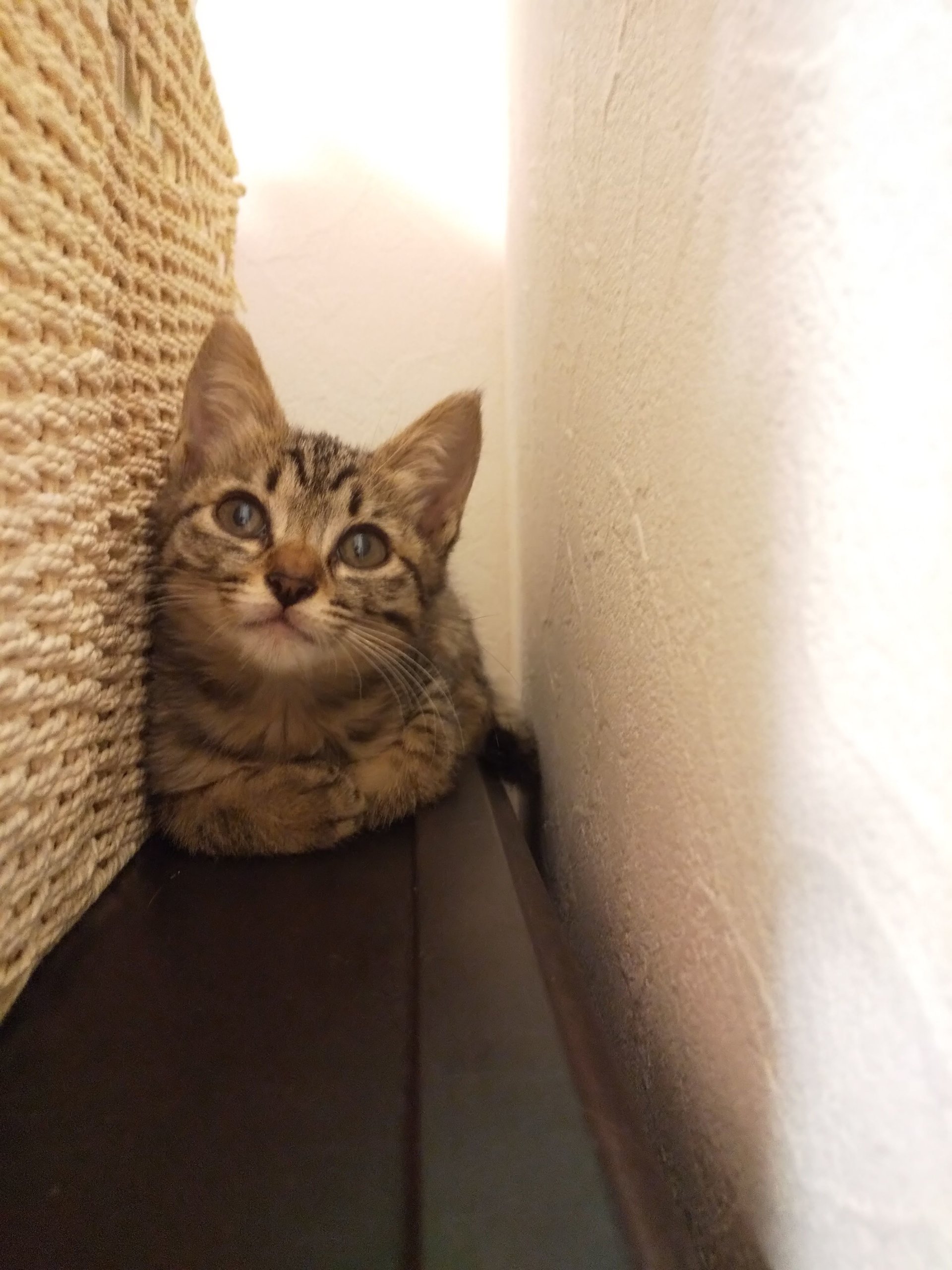 外で大きい猫に追いかけられ、アパートの物置の下に隠れ一晩中鳴いていたので保護しました。