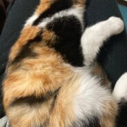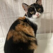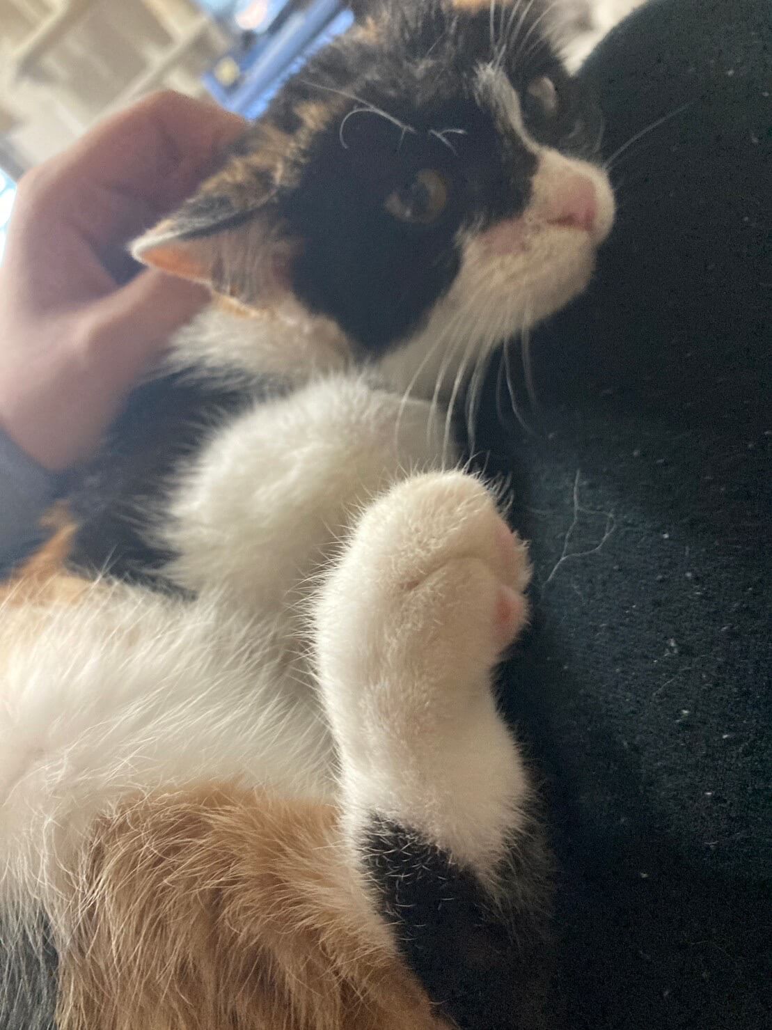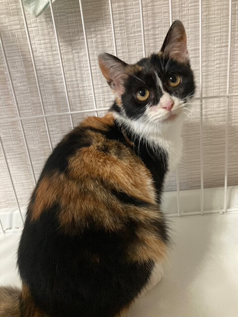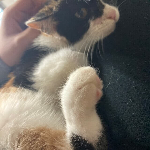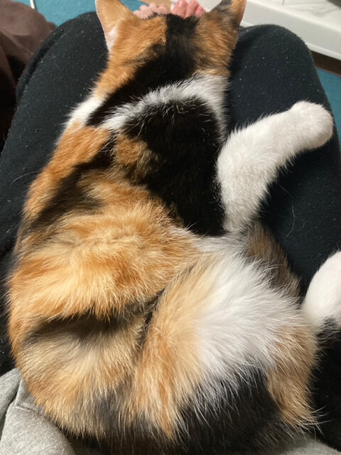 三毛猫らしい綺麗な模様で、お腹は白いです。
