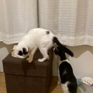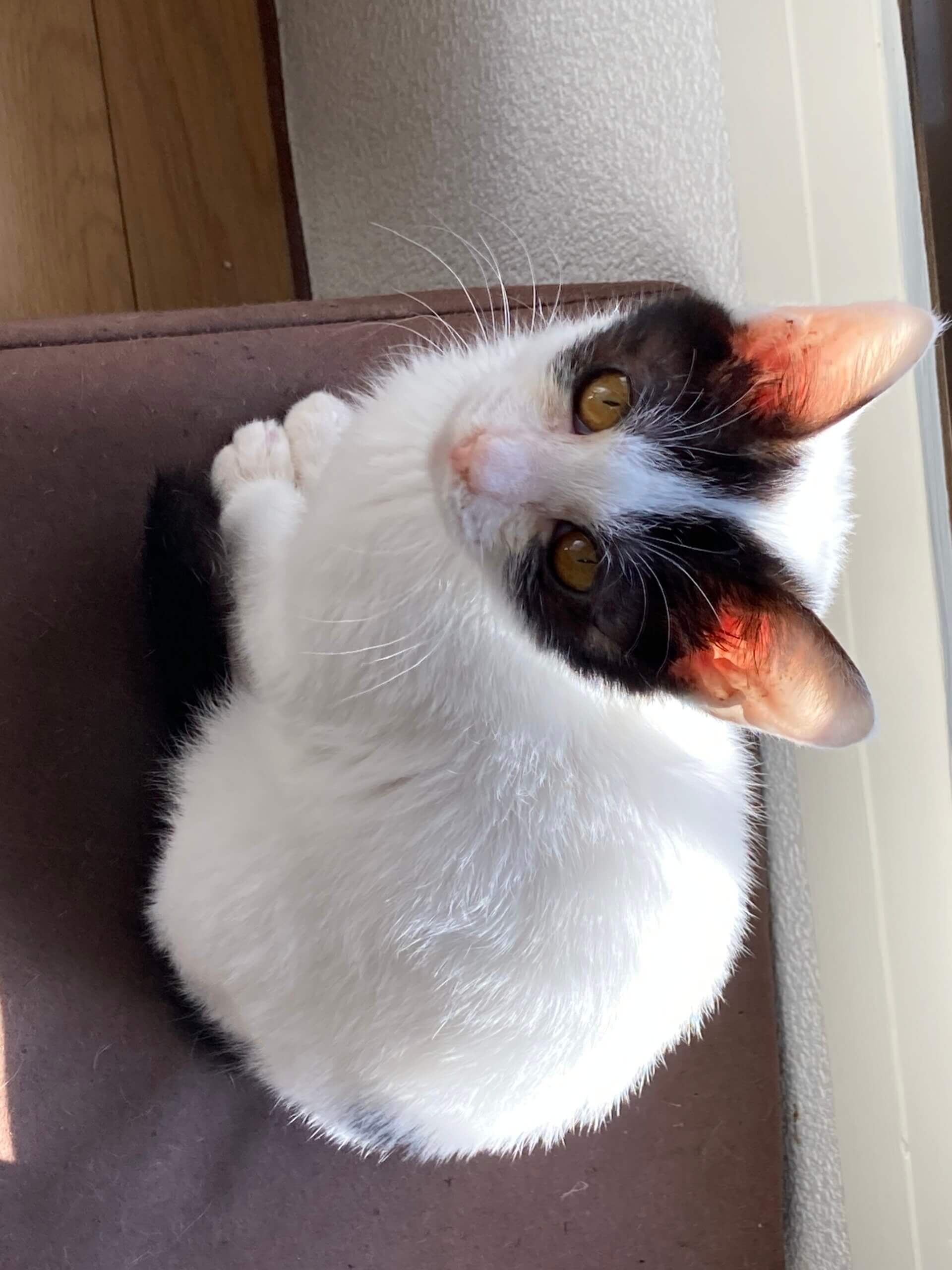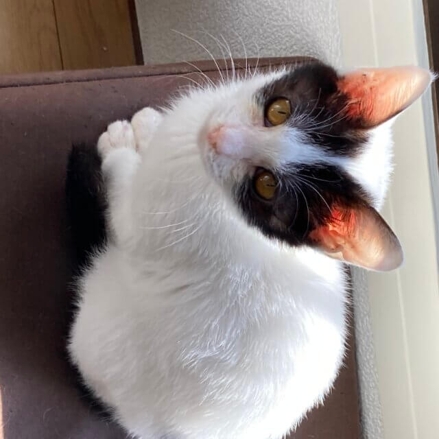 お顔はハチワレ、体は白で黒ブチが少し入ってます。