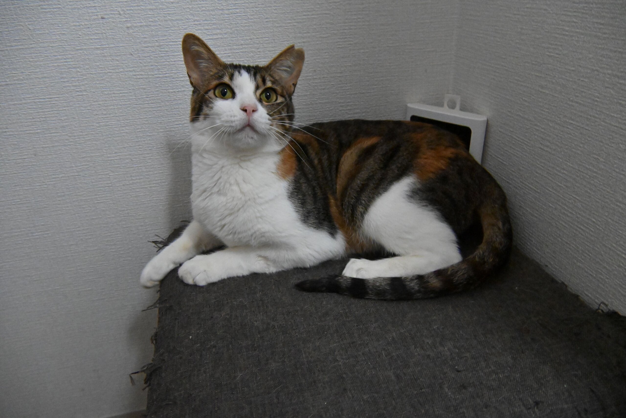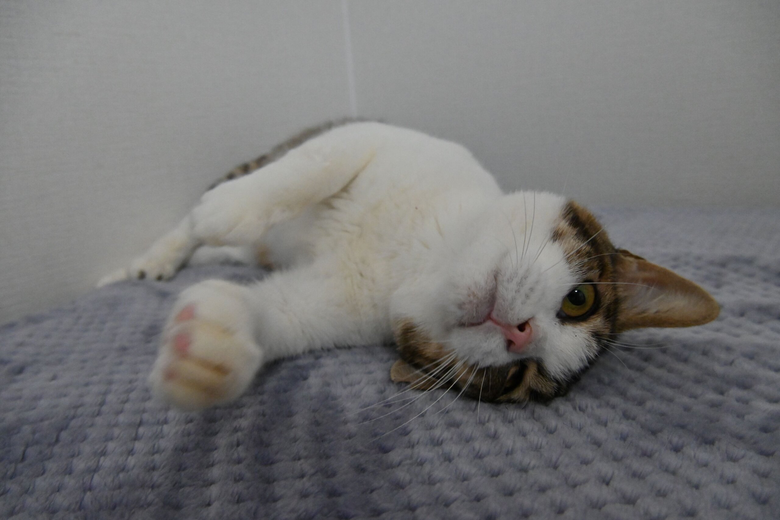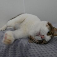 また、施設のキャットウォークからの着地に失敗し、右肘関節脱臼しました。治療の末、骨の位置は元に戻り安定していますが、獣医さん曰く高所からジャンプさせるのは当分NGとのことです。