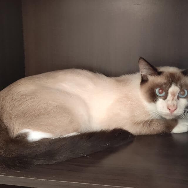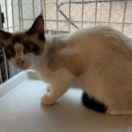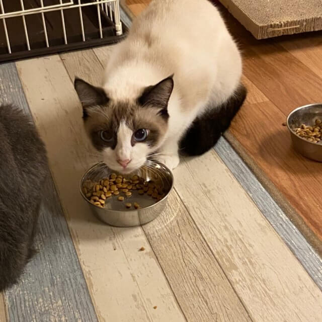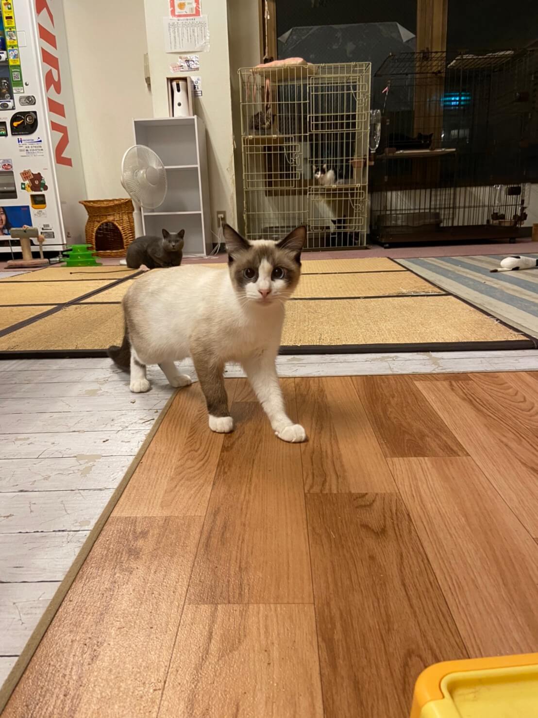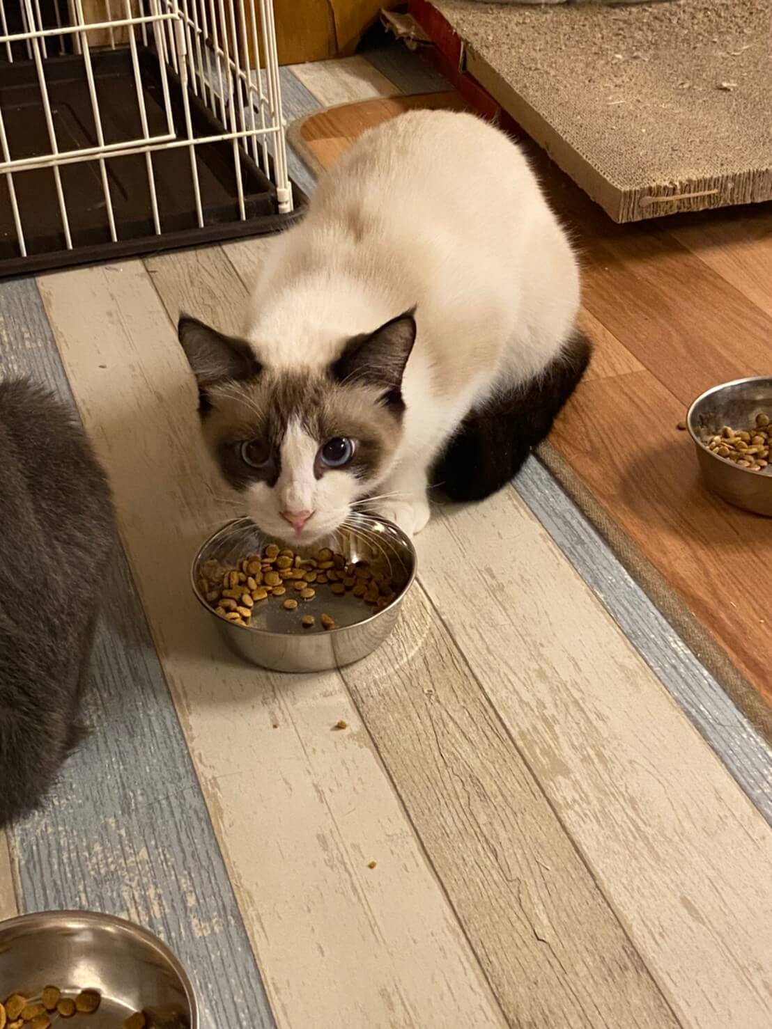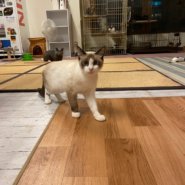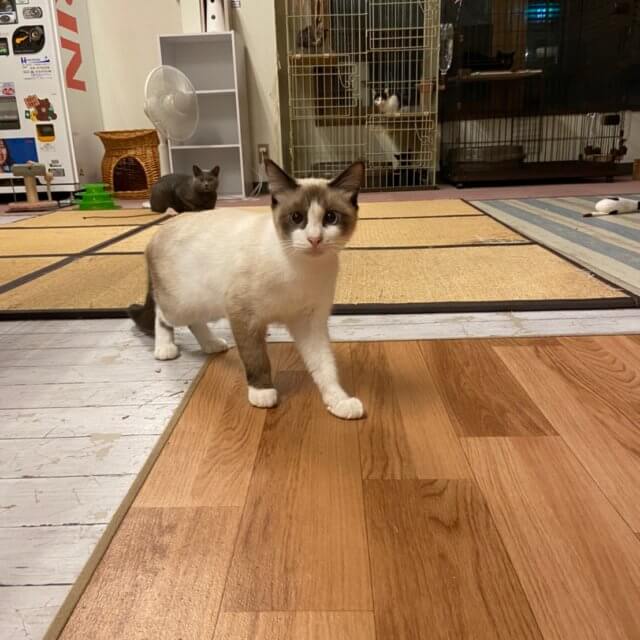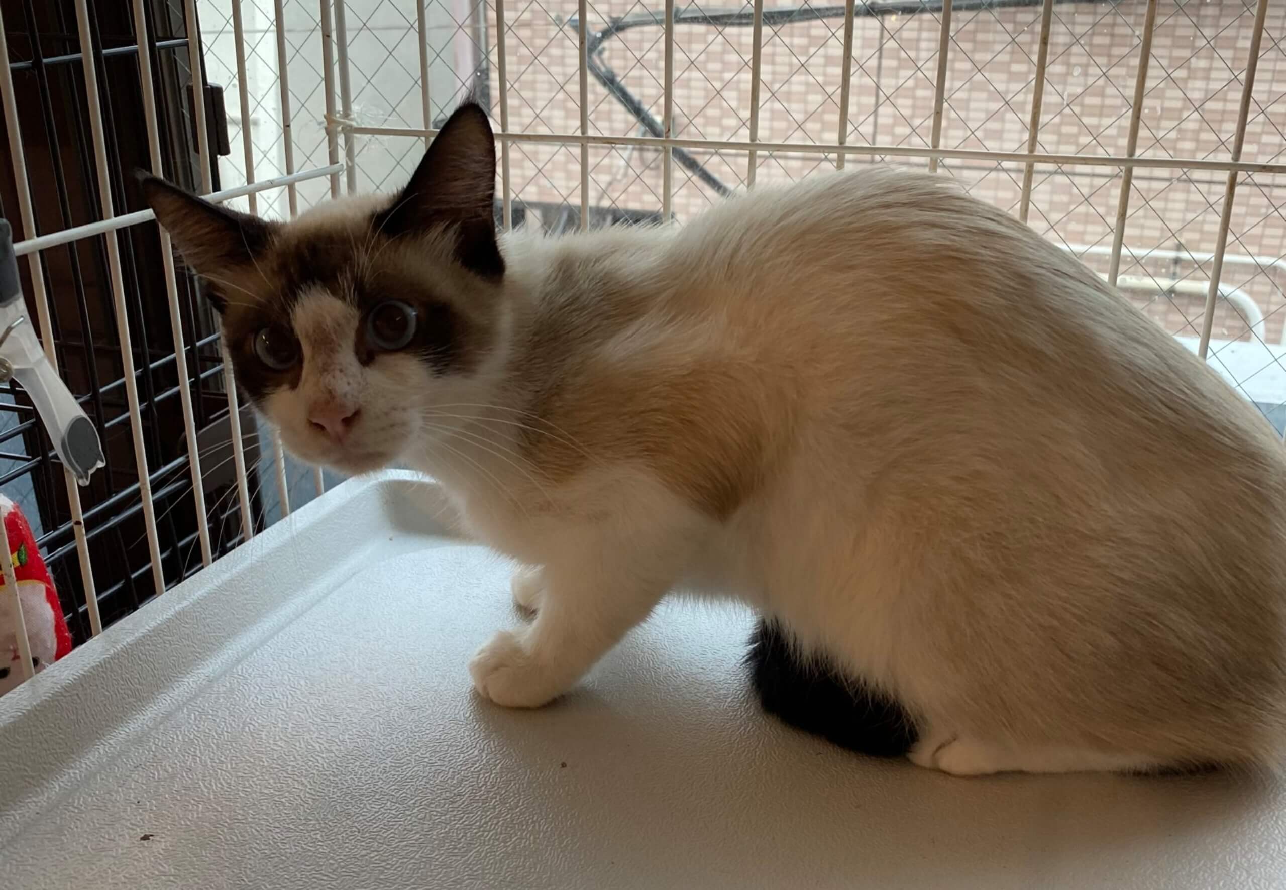 シャム系が混じってるような柄のパンくん。とてもこわがりさんでおとなしい子です。現在人馴れ訓練中です。同部屋の自分より若い子のグルーミングをよくしていたり面倒見のいい一面も。