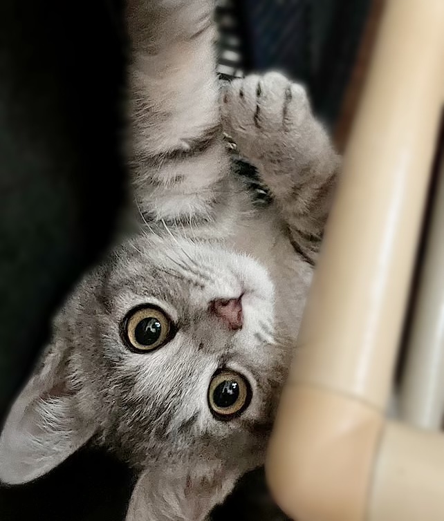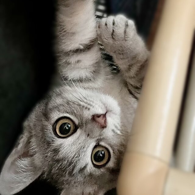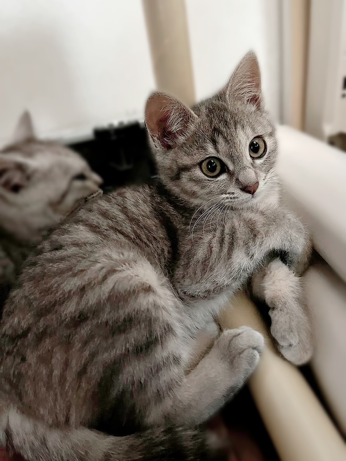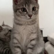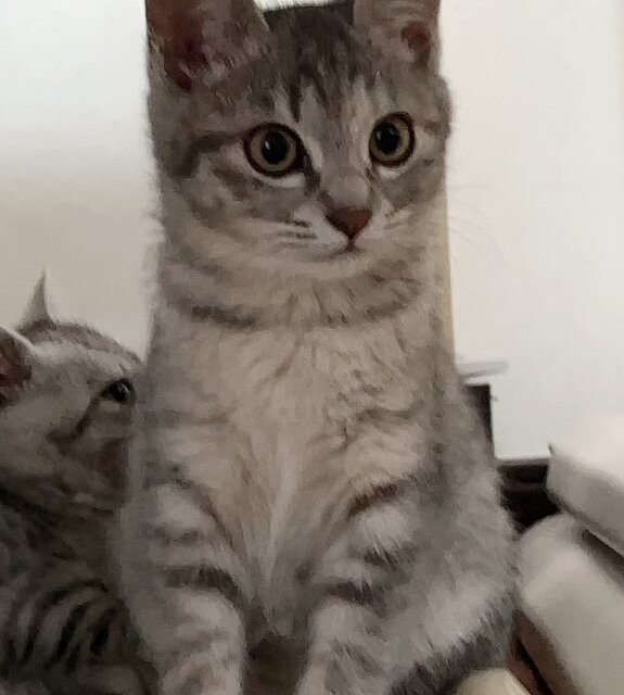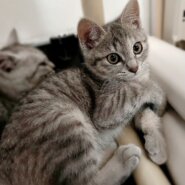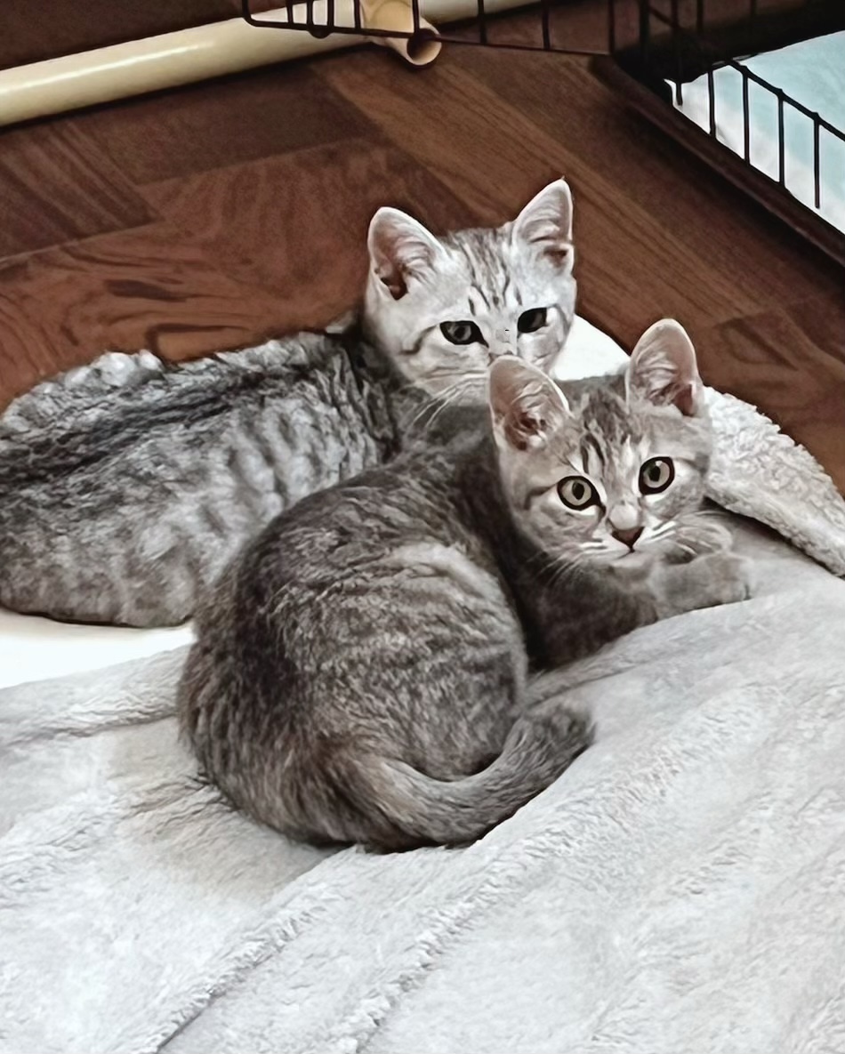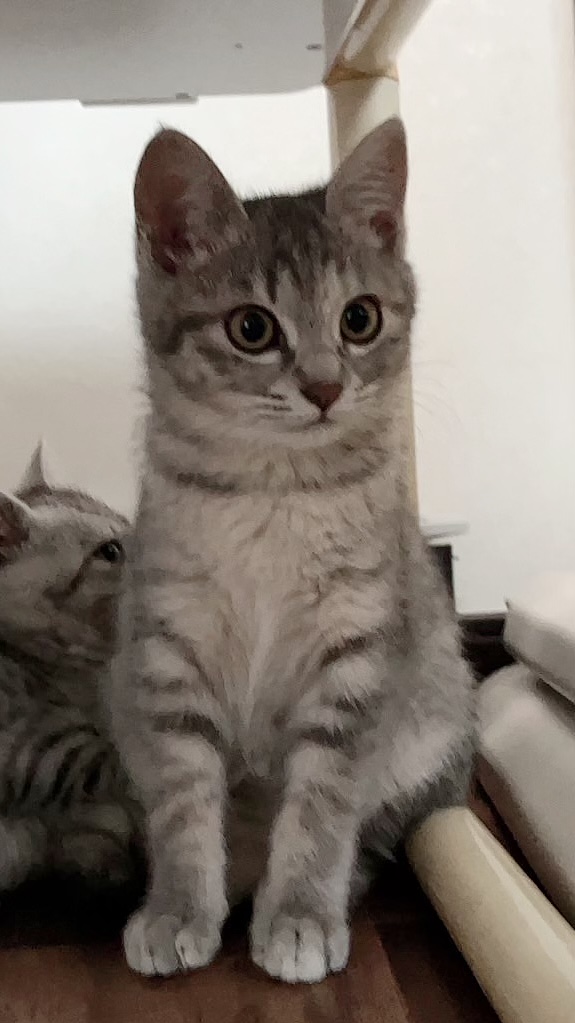 まだ少し野良猫気質がありますが、人にも慣れてきて兄弟とよく遊んでいます。もう1匹のサバトラの男の子についていくタイプです。