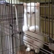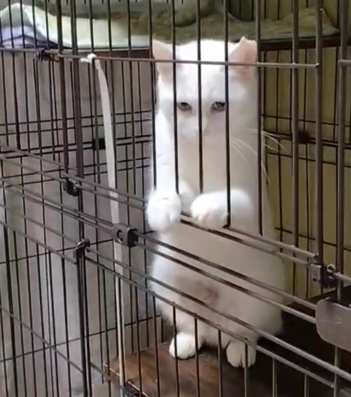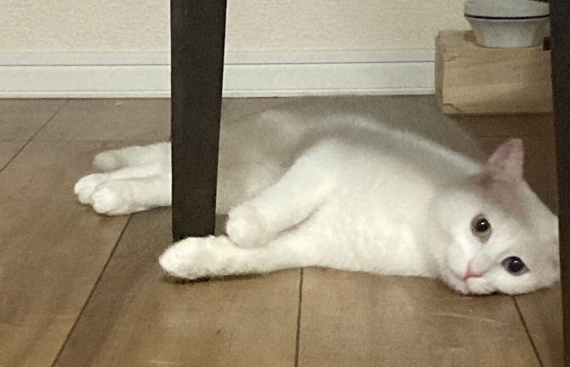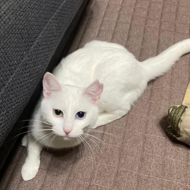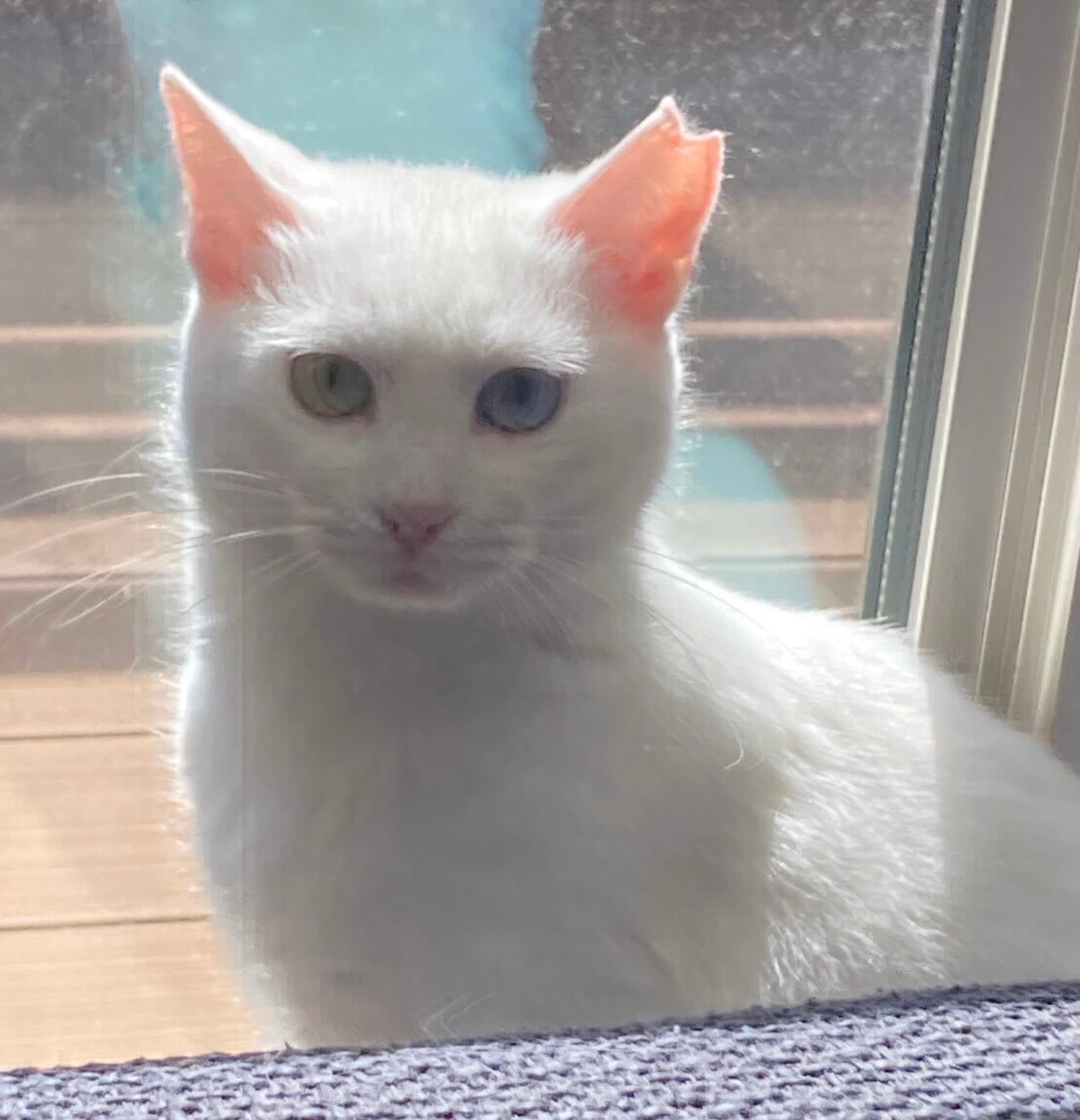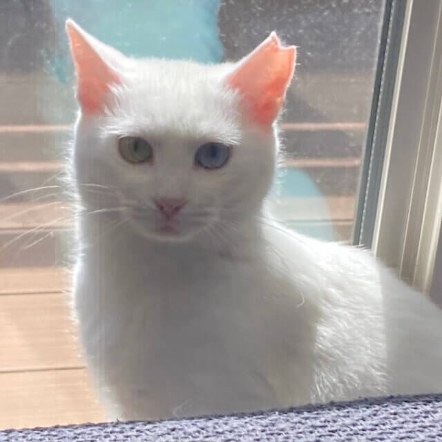 とても綺麗な白猫で、オッドアイ(右目グリーン・左目ブルー)です。