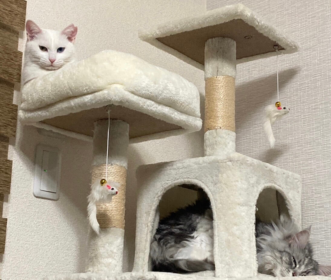 名前を呼ぶとお返事して可愛いです。ビビりで、人馴れ修行中ですが、フリースペースで遊んだり、先住猫と一緒に過ごしています。