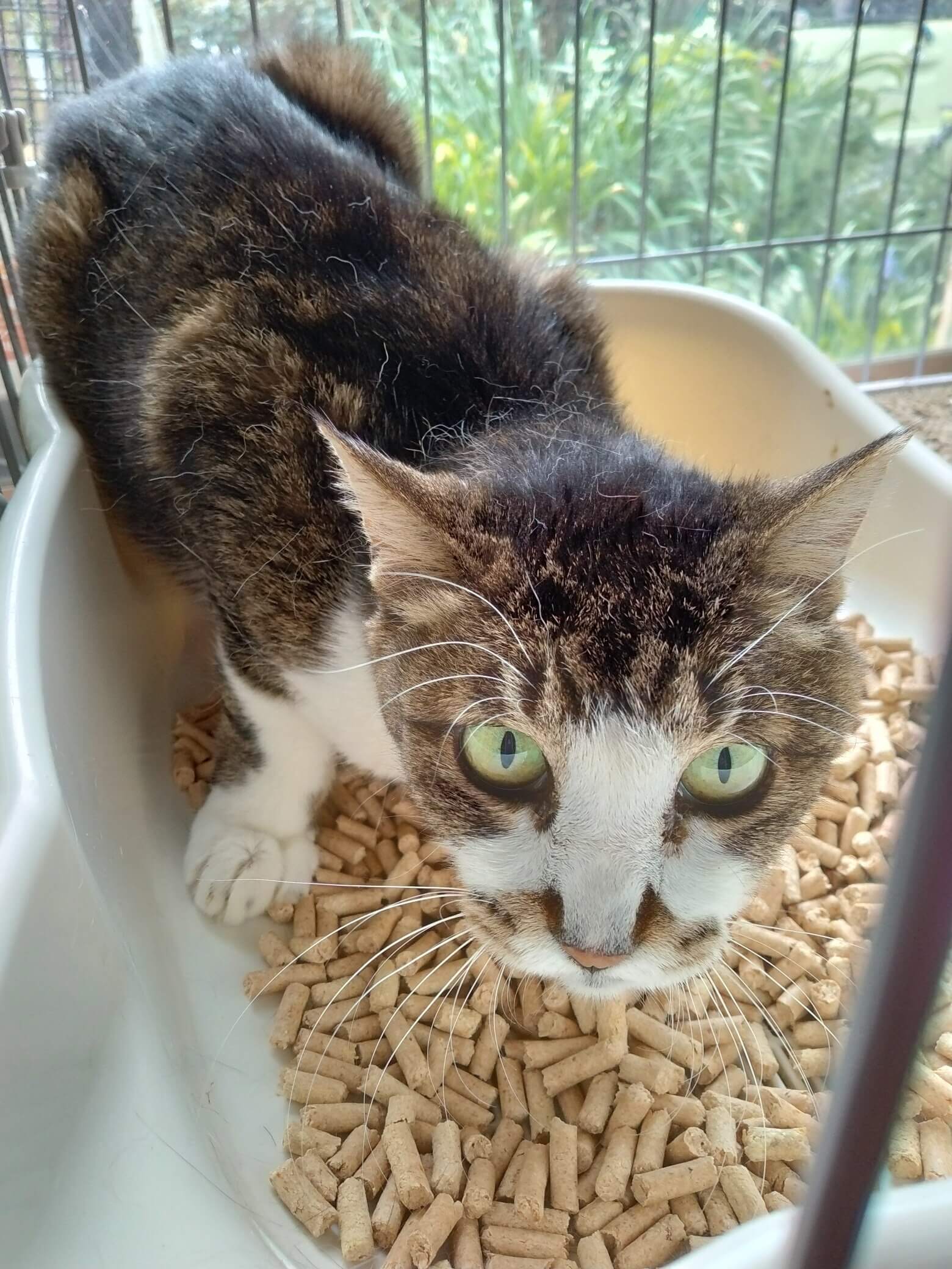 とても落ち着いている成猫ですが餌を食べる時だけ少し食べては離れまた食べる不思議な行動をします。ほかの猫と喧嘩する事も無くマイペースで日中は部屋の隅の猫ベッドにいる時間が長く一日のルーティンが決まっているらしく夜になるとゲージに戻り寝ています。人には慣れていますが、家の中での生活が初めてなので訓練中です。尻尾は中長鍵尻尾です。模様は鼻筋が白く口元から首筋へ胸と白色が続き手足の先が白いのですが鼻の左右対称にダークグレーの筋模様が特徴です保護する前は林の中で私の姿を見つけると駆け寄ってスリスリ行動がありましたが、現在は急激な環境変化に慣れつつトイレも一度も問題ありません。給餌時はナデナデオッケーです。