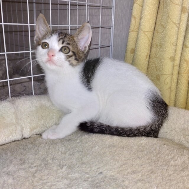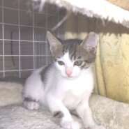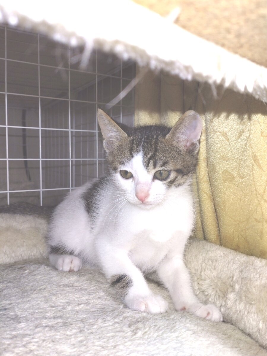 仔猫達の中で一番大きく元気いっぱい。サビ白の仔猫ですが白の部分が多く美しい仔猫です。好奇心がおおせいで動くものを見つけると一番に追いかけています。感染症の検査はまだですが、親猫は感染症すべて陰性でしたのでこの子も大丈夫だと思います。食欲は大せいで現在仔猫用ウェット餌とカリカリを与えています。