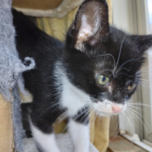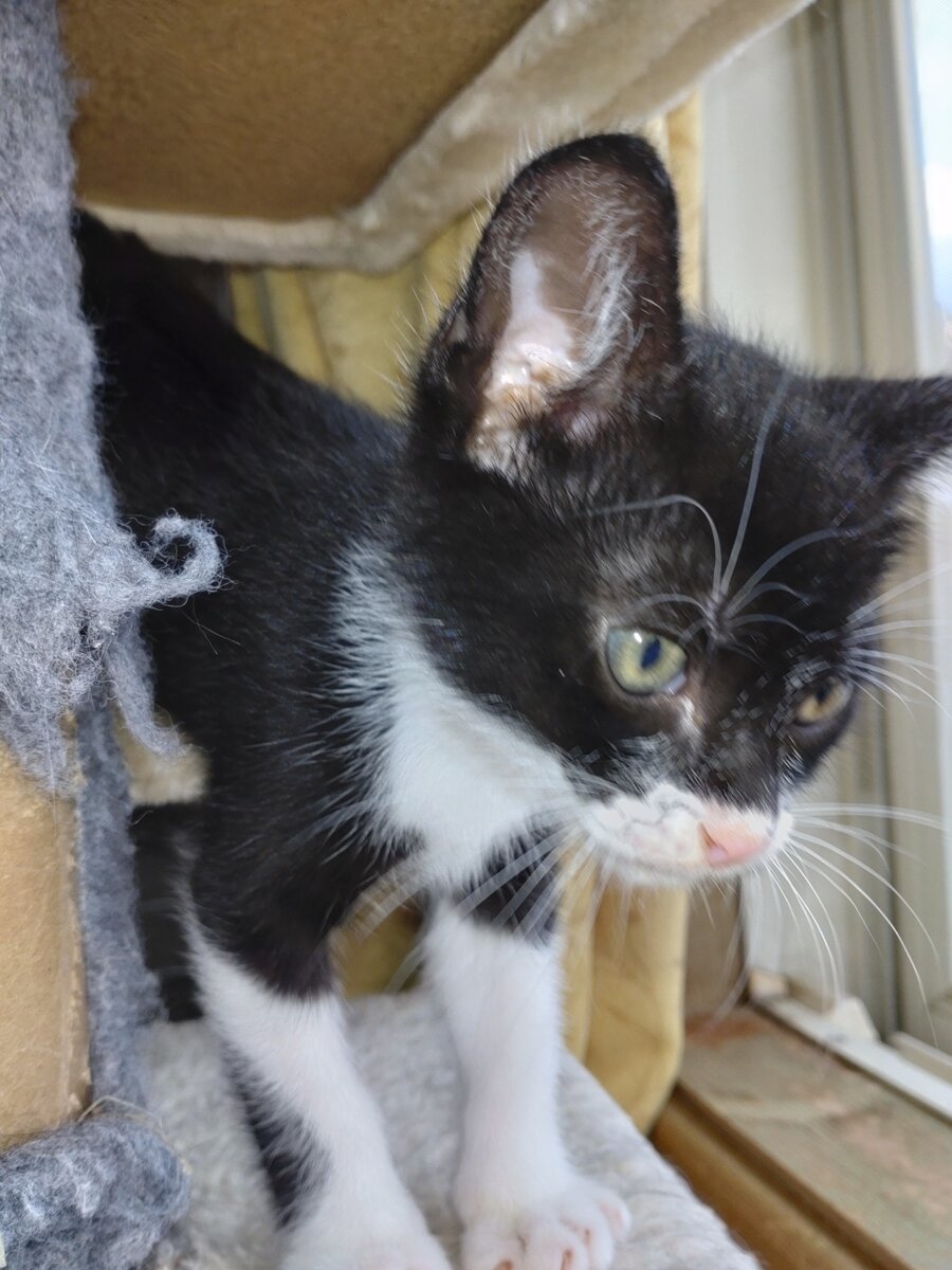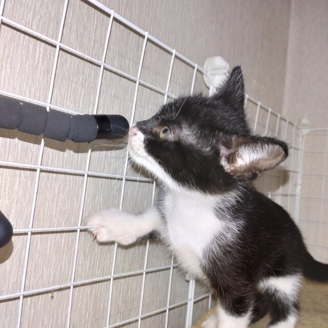 一週間遅生まれの弟妹猫と激しく優しく遊んでくれる仔です。ご飯の時も小さな仔猫に場所を開けてくれる優しさがあります。