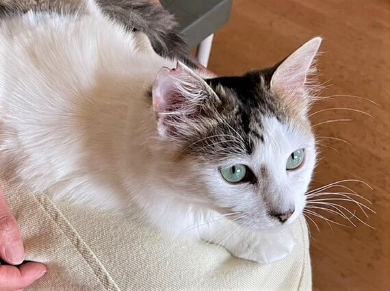 膝の上で撫でてもらうのが大好き。おとなしく、いつまでも乗っています。