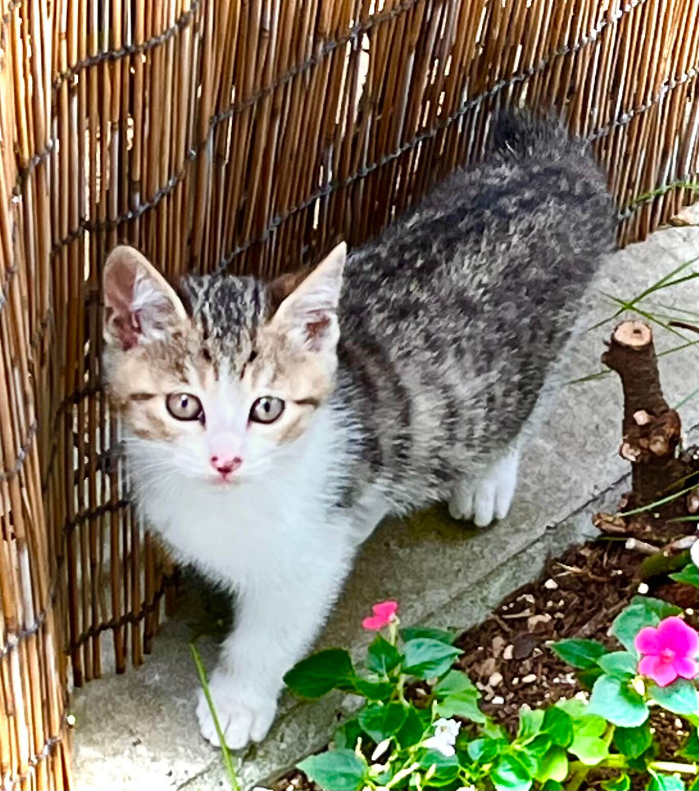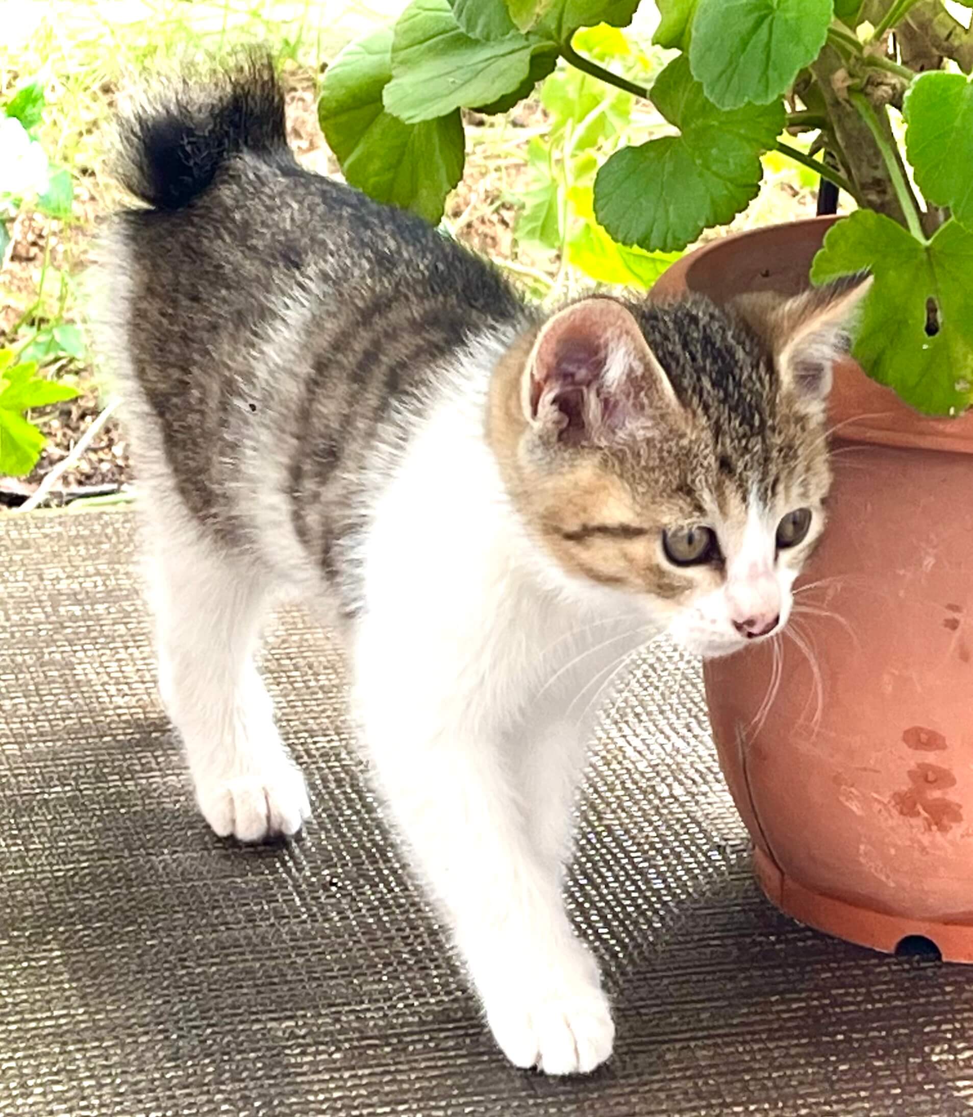 庭によく来ていた猫が2ヶ月前に子猫を咥えてきました。母猫が一生懸命子育てしていますが、自分でご飯を食べたりトイレをしたり出来るようになったので里親さんを探しています。