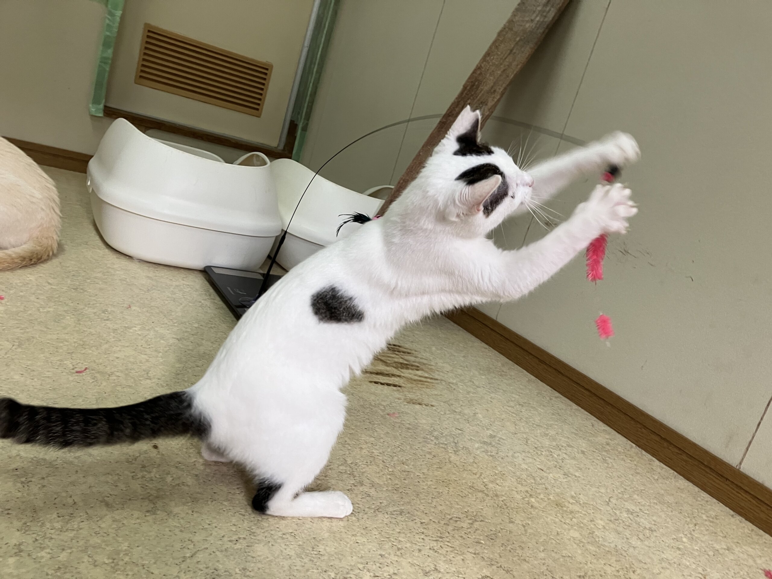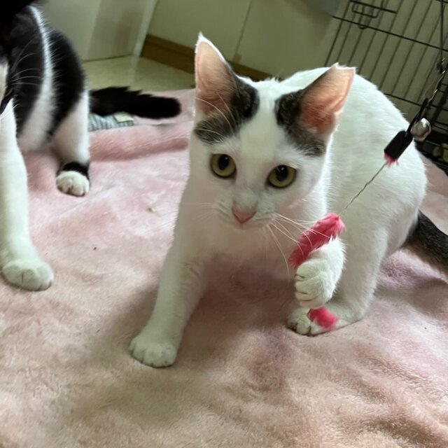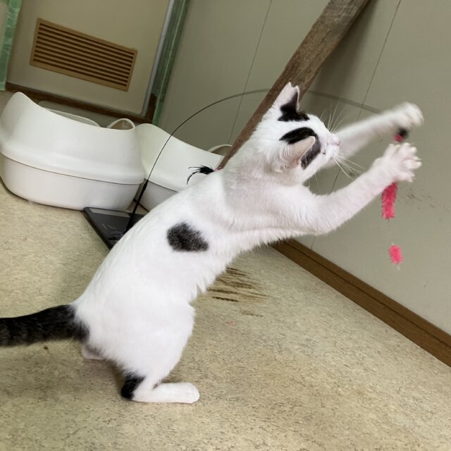 大人しめでまったり過ごしてます。遊ぶのも大好きで、ビヨンビヨンする猫じゃらしが特にお気に入りのようで、1人でずっとジャンプして遊んでたりしてます。
