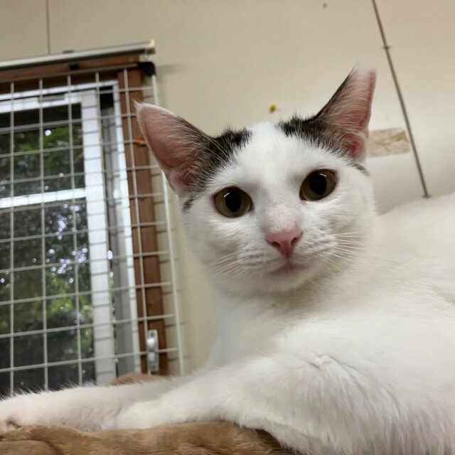 白色で耳の付け根や尻尾などがサバ柄が入ってるお顔が美人さんで体も他の子より小柄のマロちゃん。